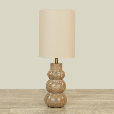 The soft taupe handloom shade filters light beautifully, creating an inviting atmosphere in any room, while the polished grey marble base provides a grounding element of natural beauty.