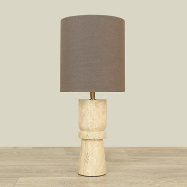This table lamp combines a verdant green marble base with a handloom poivre shade accented in warm beige tones.