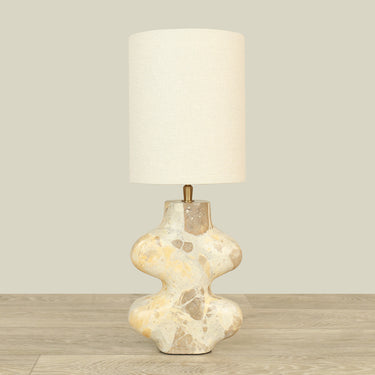The natural boucle shade offers soft, inviting illumination with subtle visual depth, while the marble base anchors the piece with understated luxury.