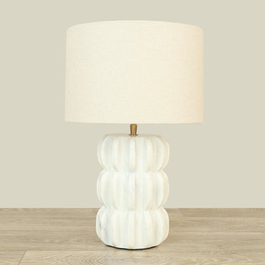 A harmonious blend of texture and material, this table lamp features a natural boucle shade that softly diffuses light with organic warmth, paired with a substantial marble base that grounds the design with quiet sophistication.