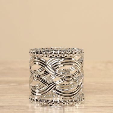 Treat yourself to a touch of opulence with this pretty napkin holder. Adorned in a shining silver finish, it features exquisite scrollwork and mill grain detailing along the edges, imparting a distinctive and stylish charm. Whether for an elegant meal or an impromptu get-together, this holder adds a delightful flourish to your table setting.