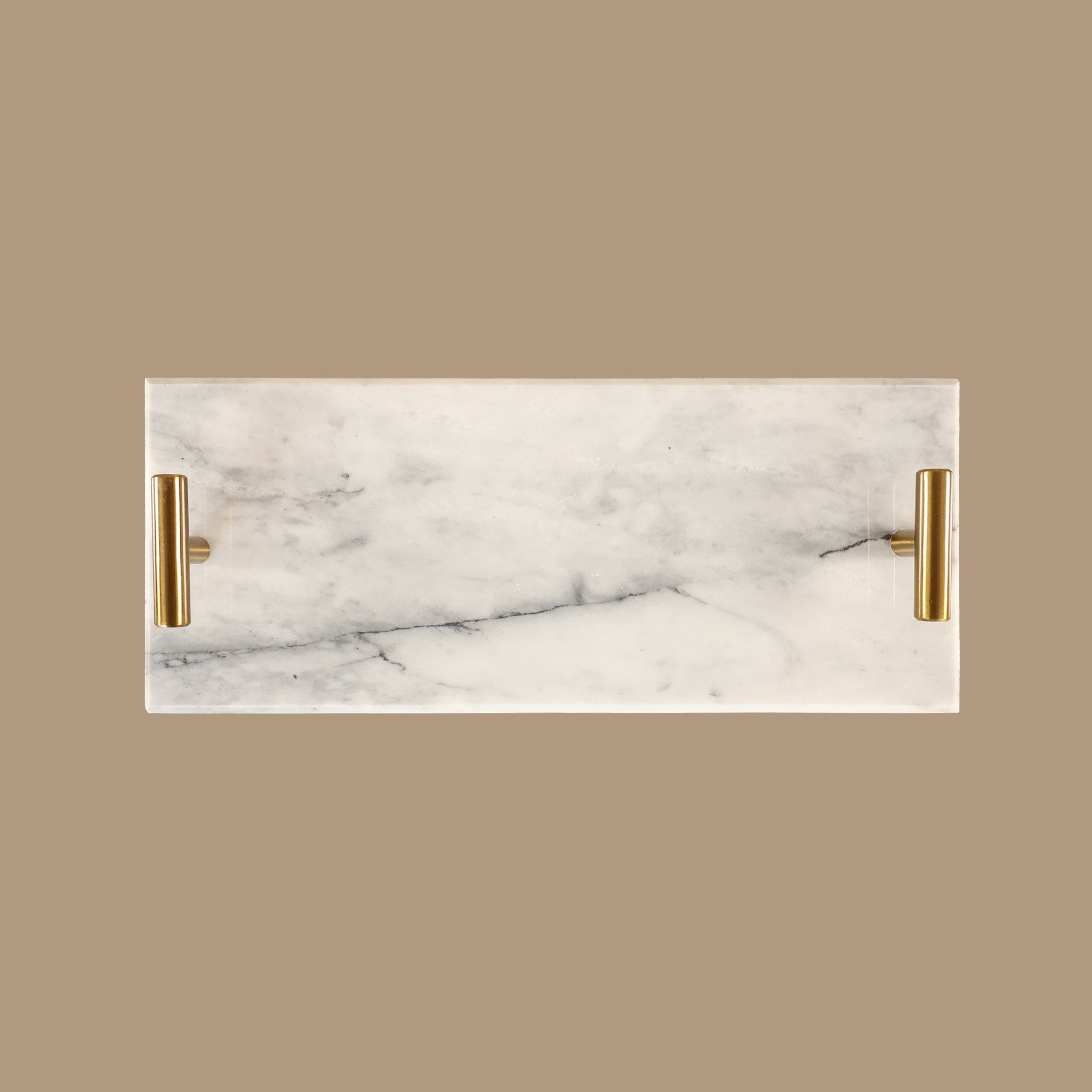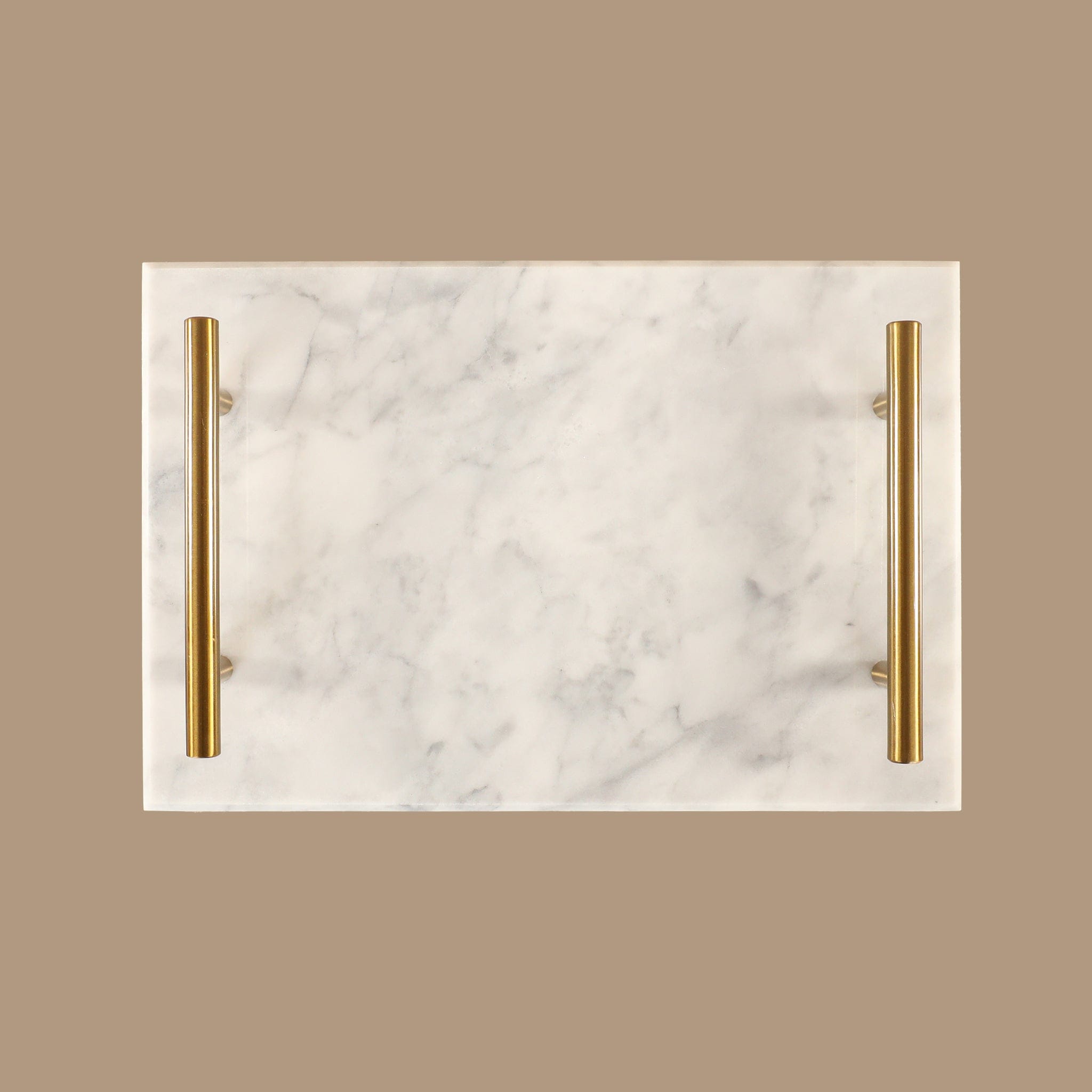 Serve delicious appetizers or desserts on this sleek Marble Tray. The beautifully veined marble tray is highlighted by shining brass for a classic touch. Easily portable by the sturdy handles, this tray could also be used to hold floral arrangements, bath accessories, and many other items to showcase their beauty and elevate your style.
