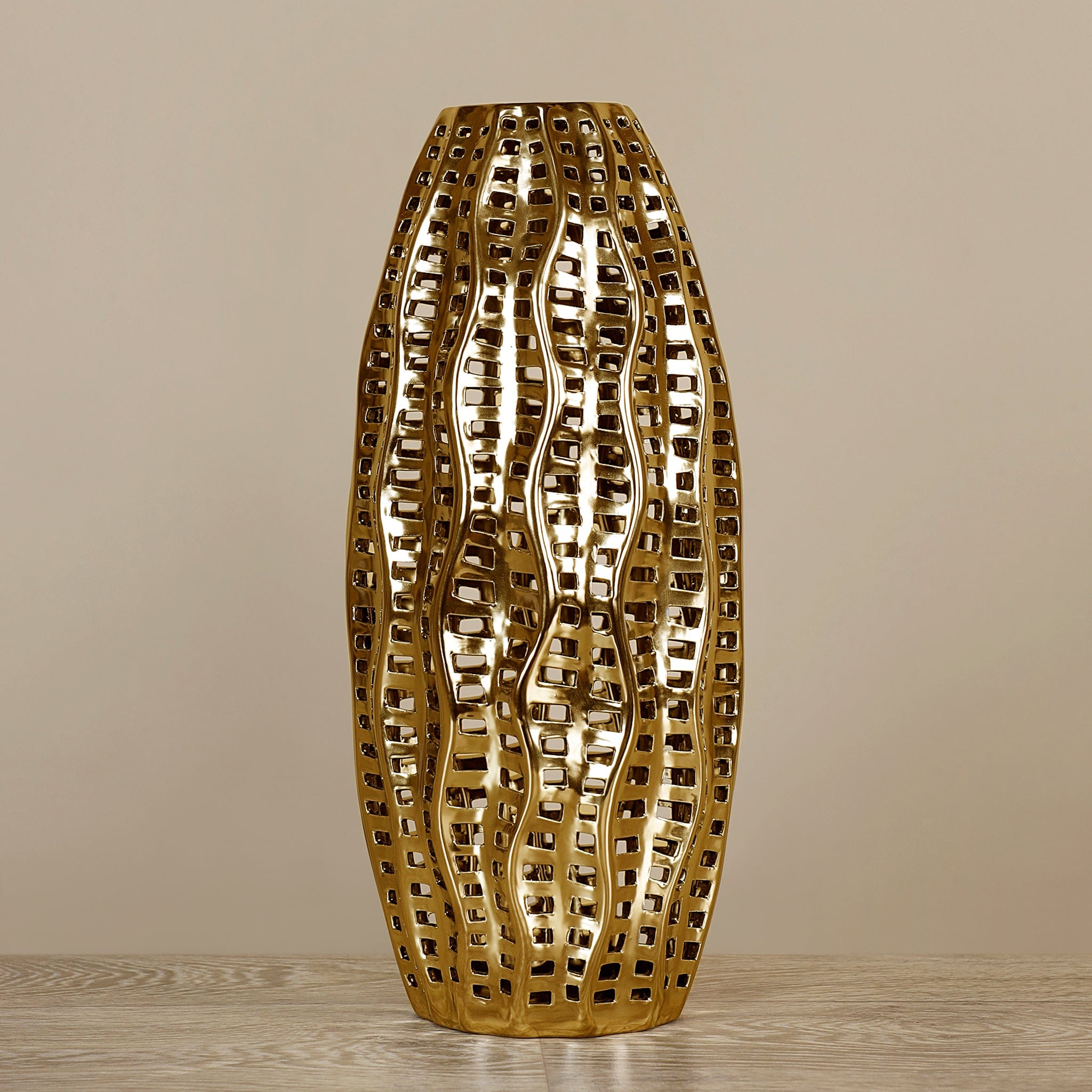Lend a glamourous touch to a space with a gleaming gold-finished vase. Crafted with simple shapes and detailed with artistic cutouts this vase is crafted in ceramic and wrapped in rich gold for a chic look.