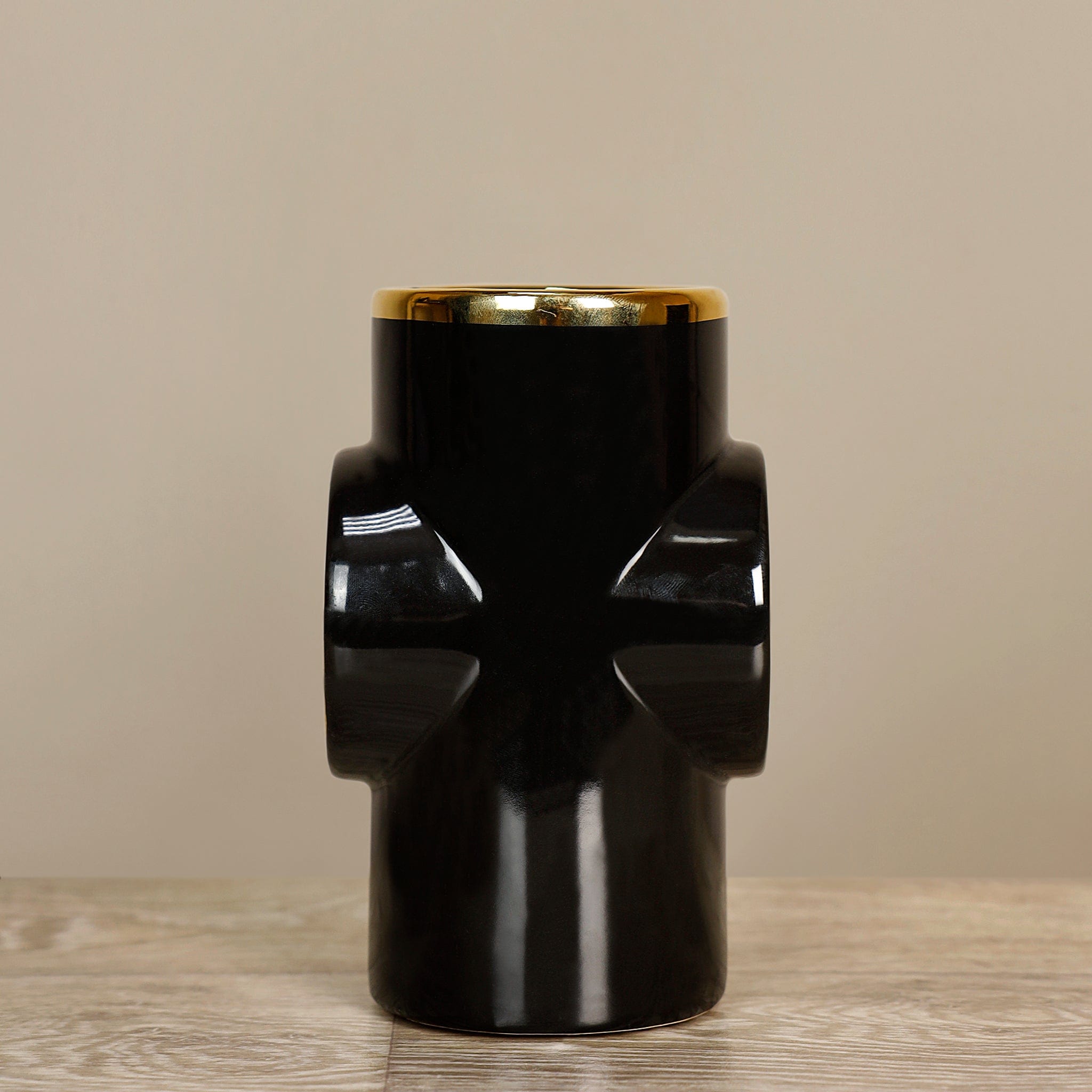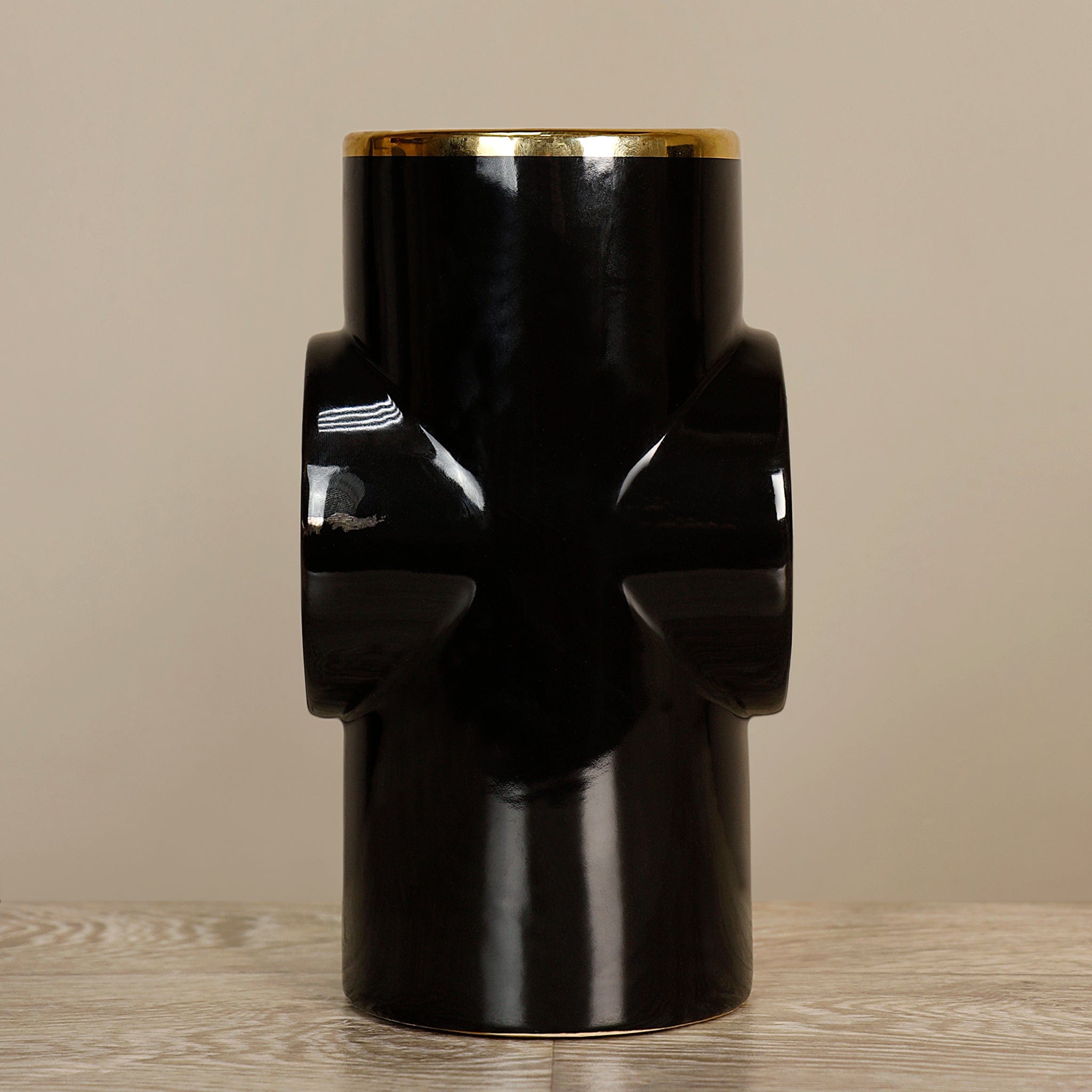 Lend a glamorous touch to a space with a unique decorative vase. Crafted with industrial flair and detailed in gold this vase is ceramic and finished in black for a chic look.