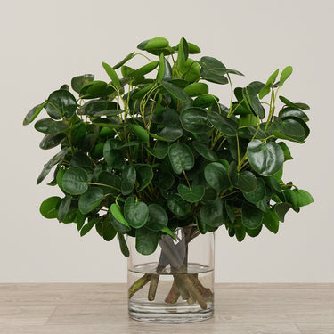 Elevate your living space with this sophisticated artificial money plant arrangement, elegantly presented in a sleek glass vase.