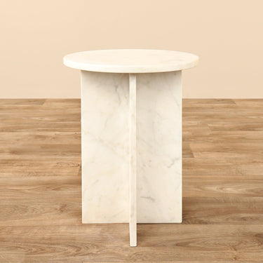 Gleaming modern marble gets warm and approachable when fashioned into an elegant side table. Designed with a round top and sleek supports this marble side table is the perfect companion to a contemporary chair or sofa. Your space will get an instant upgrade with sleek and beautifully veined marble in a minimalist design.