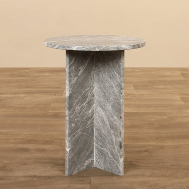 Gleaming modern marble gets warm and approachable when fashioned into an elegant side table. Designed with a round top and sleek supports this marble side table is the perfect companion to a contemporary chair or sofa. Your space will get an instant upgrade with sleek and beautifully veined marble in a minimalist design.