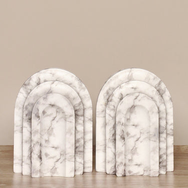 Crafted in marble this pair of bookends form a timeless arch to bring a satisfying structure to a shelf or console tale. Their beautifully veined material is showcased by the elegant form to add interest and style to any space.