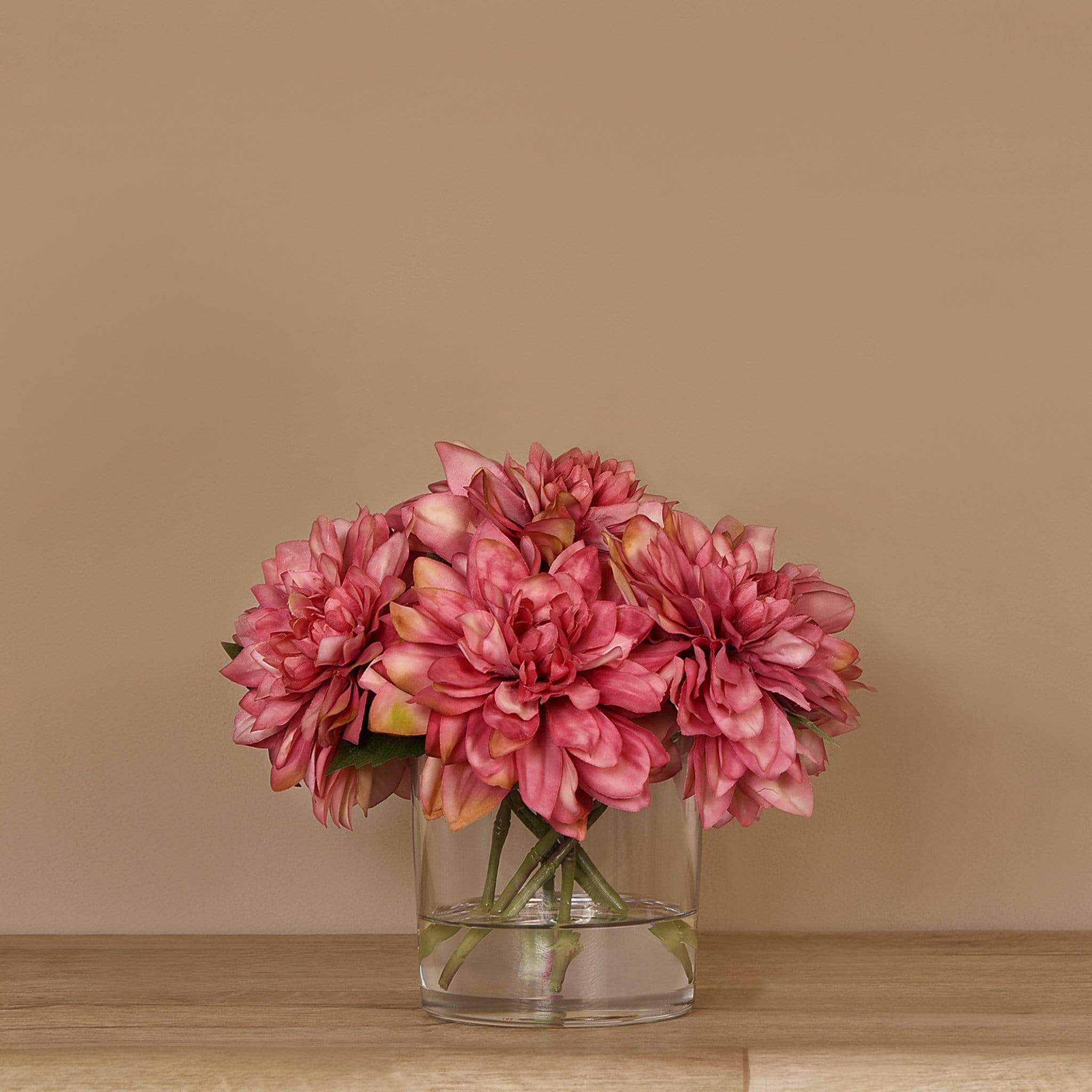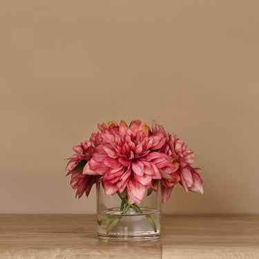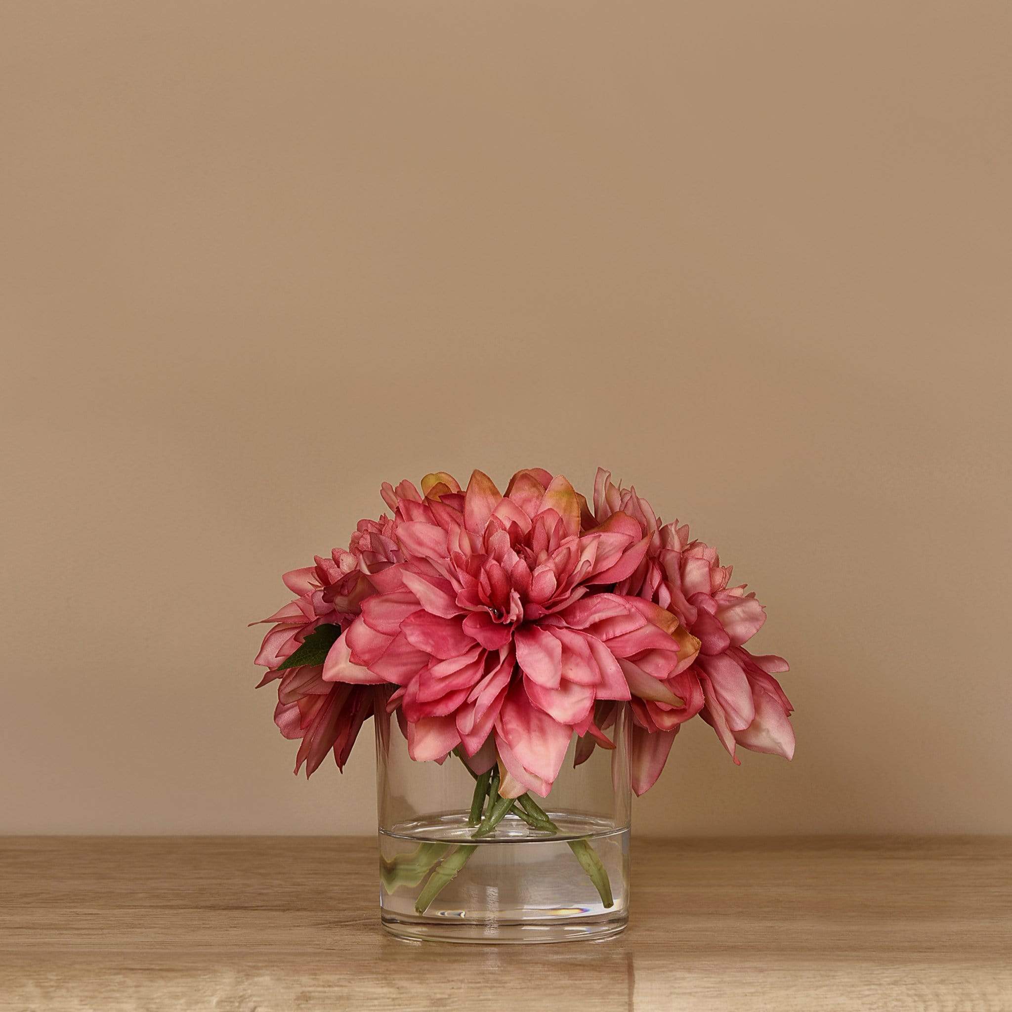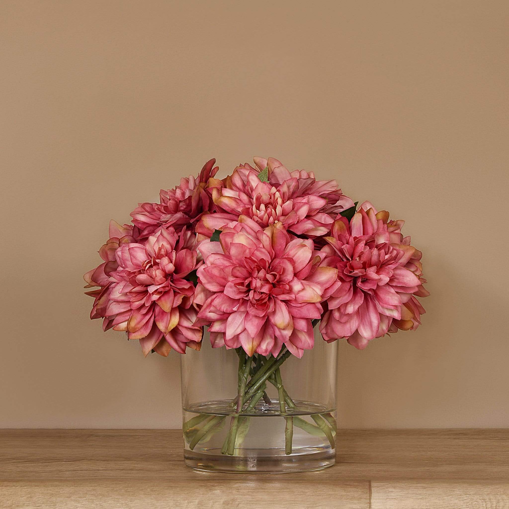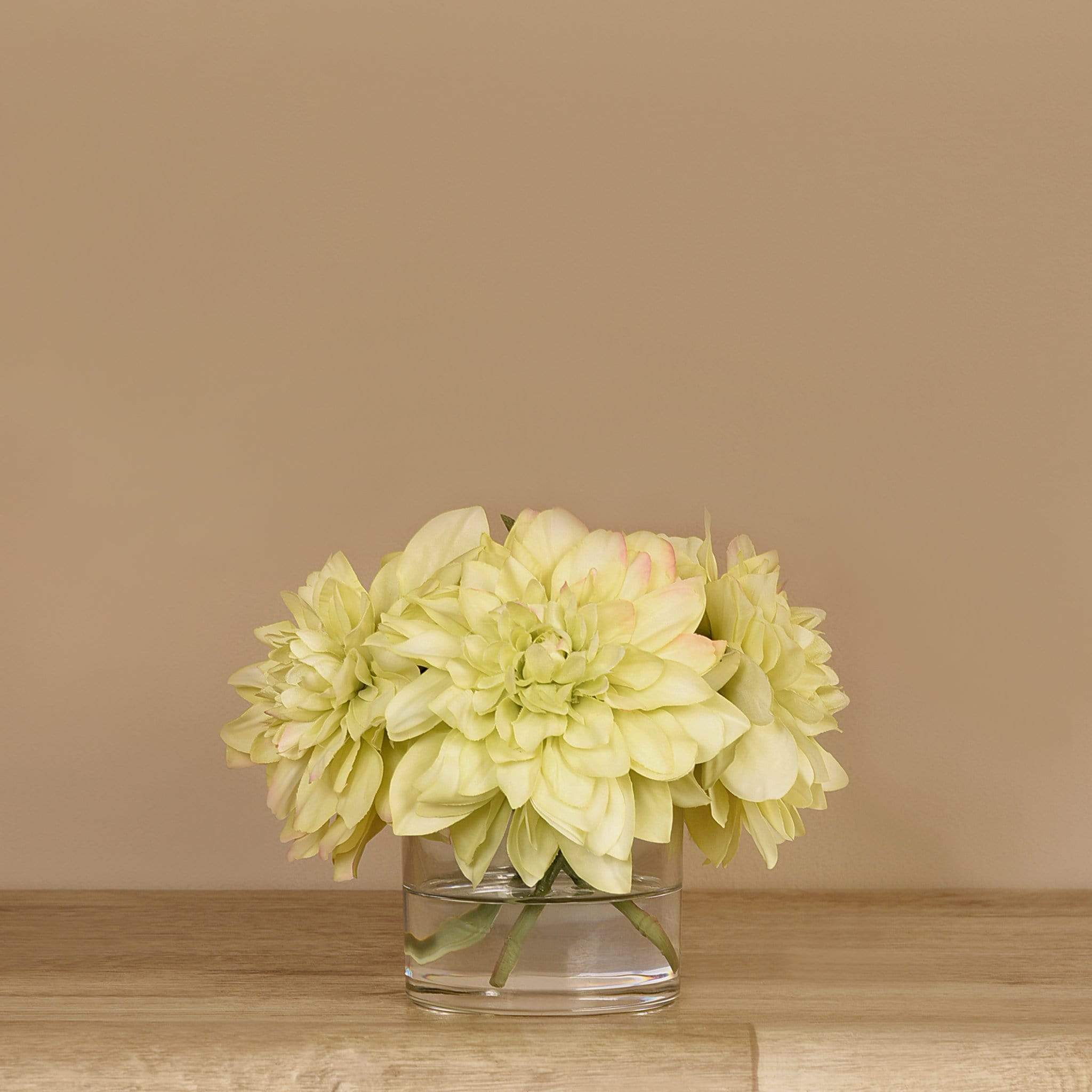 A symbol of elegance and grace, these delicate dahlias make any living space look even more sophisticated. Hand-arranged by expert florists, these faux flowers are placed in a simple glass vase for a highly realistic look.