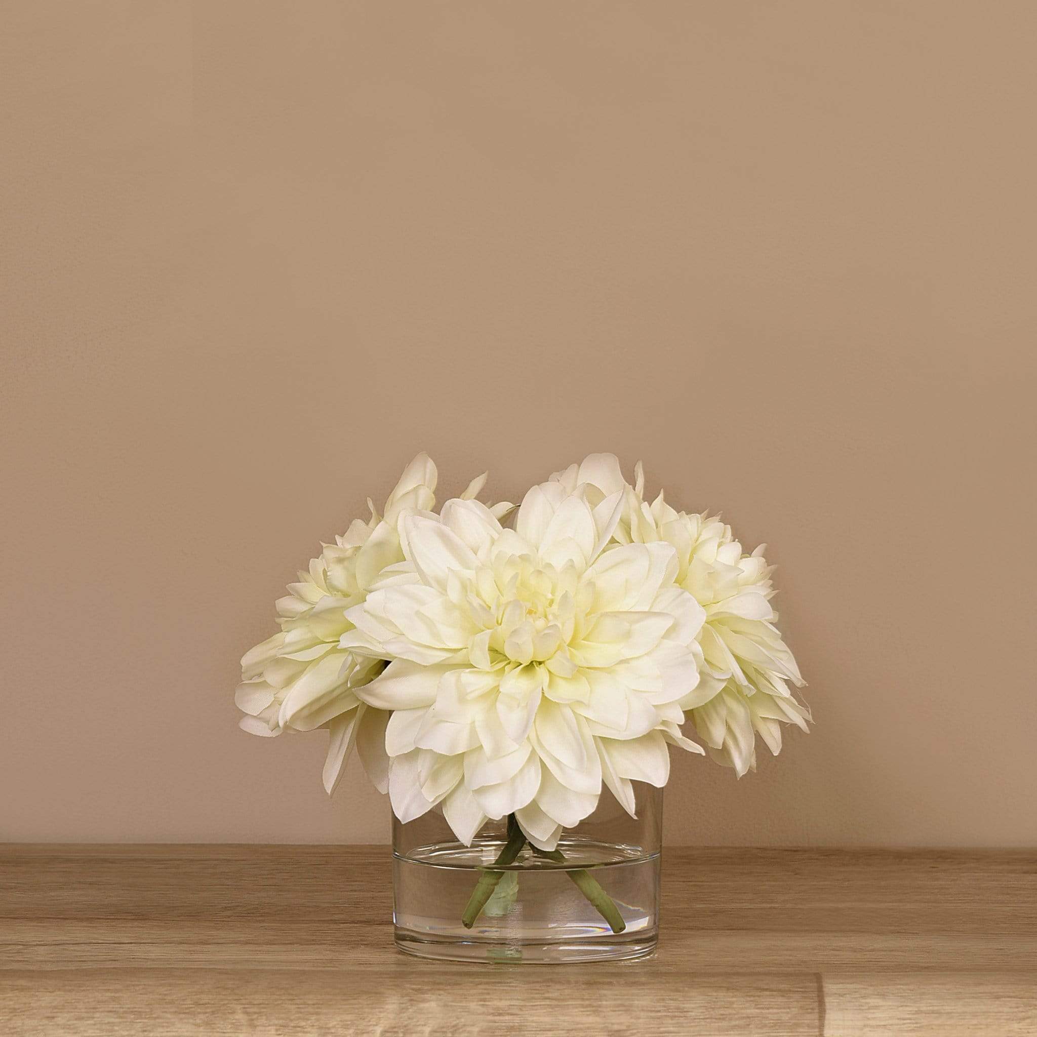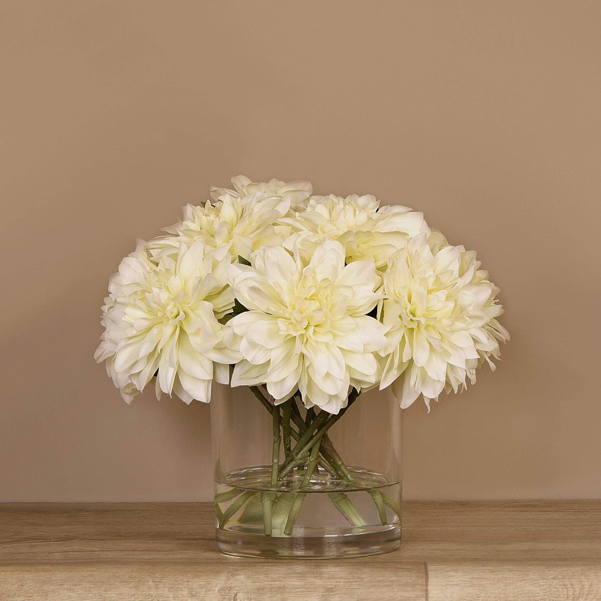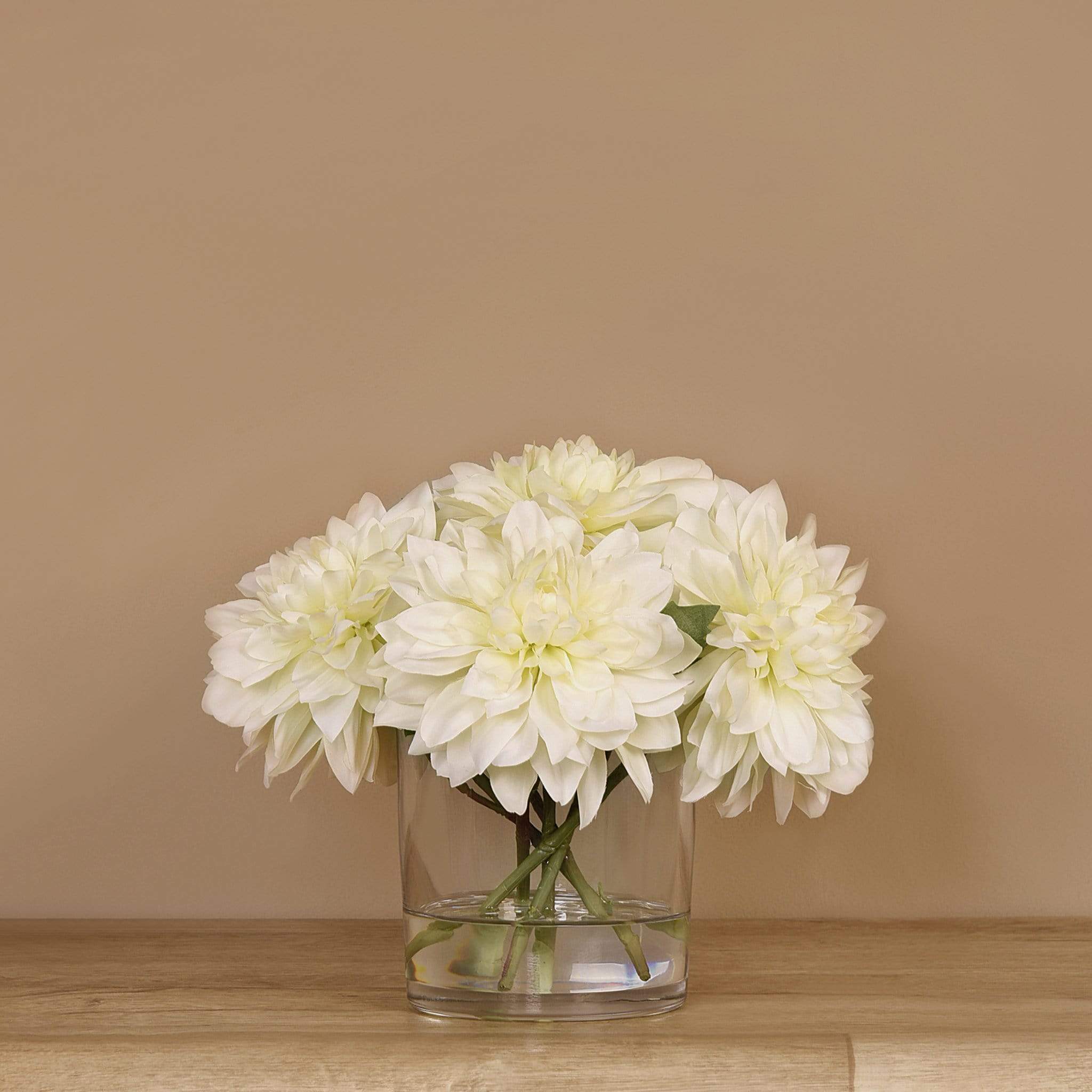 A symbol of elegance and grace, these delicate dahlias make any living space look even more sophisticated. Hand-arranged by expert florists, these faux flowers are placed in a simple glass vase for a highly realistic look.