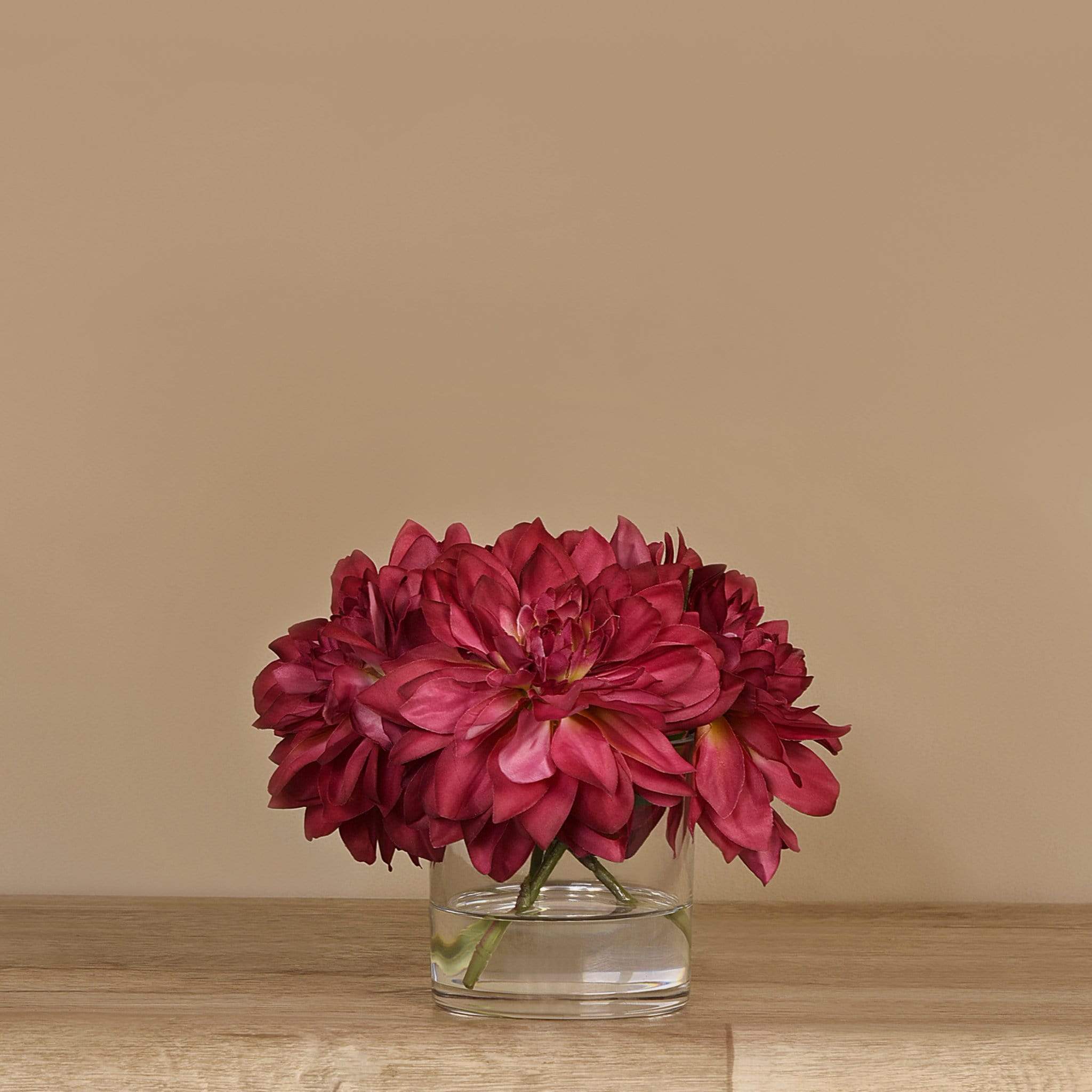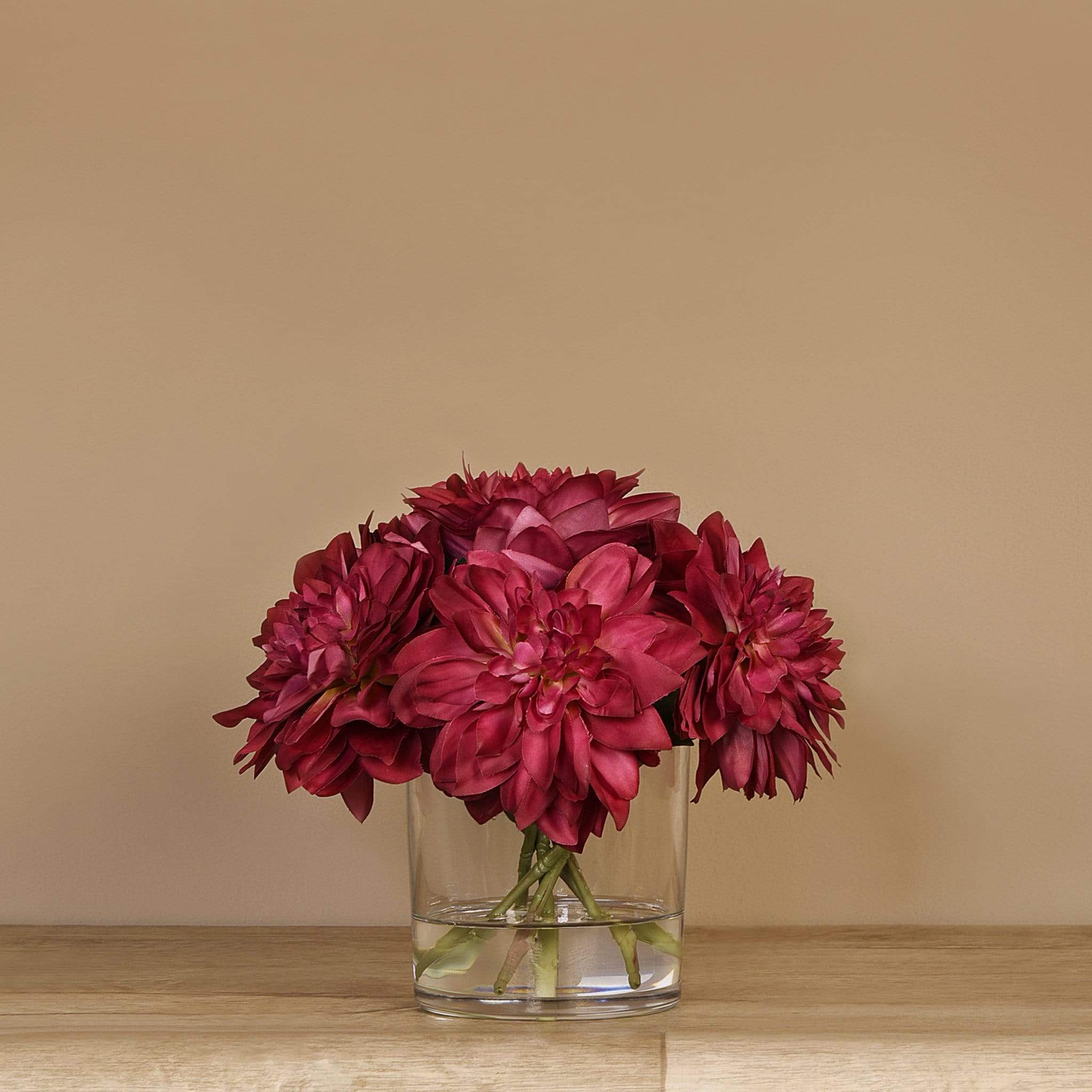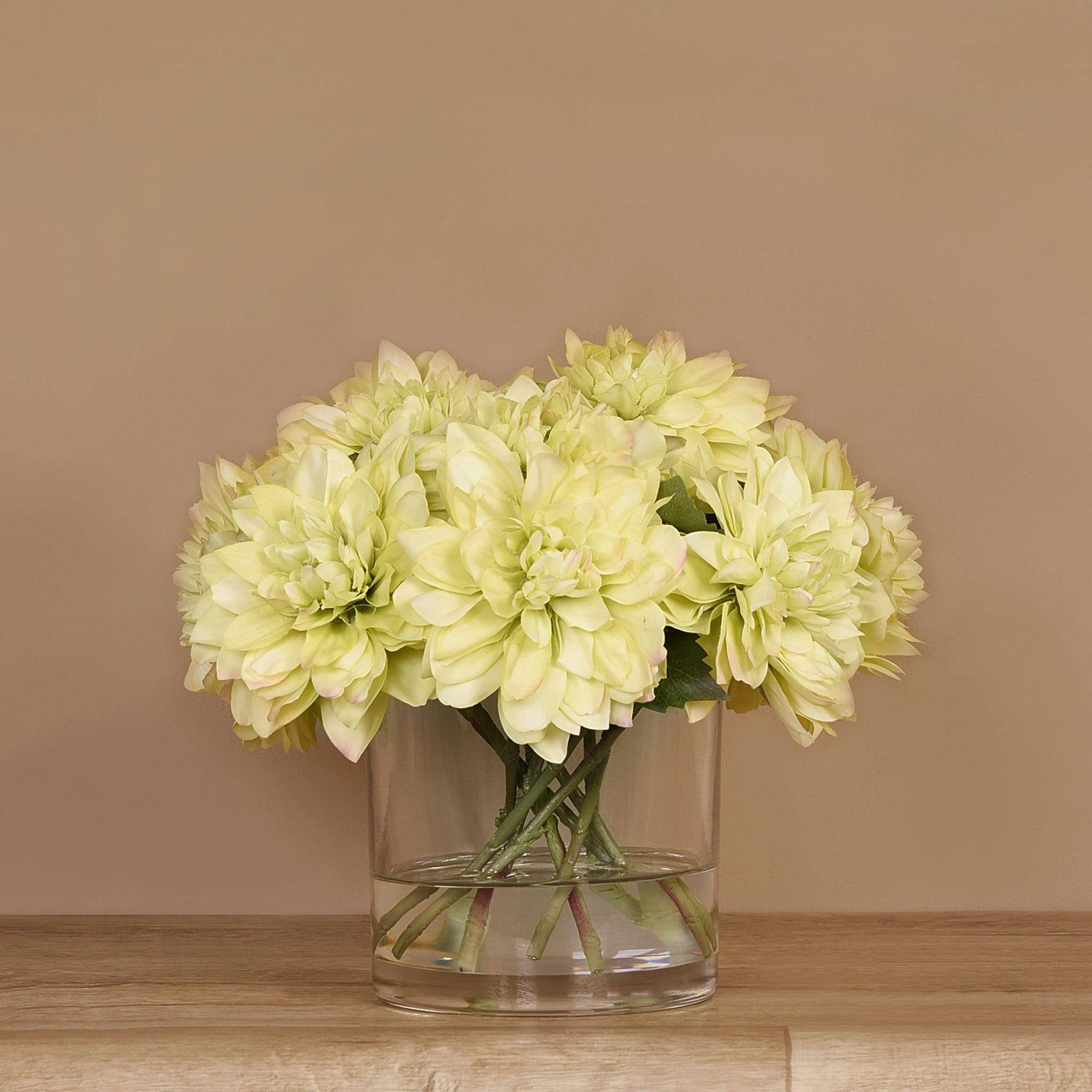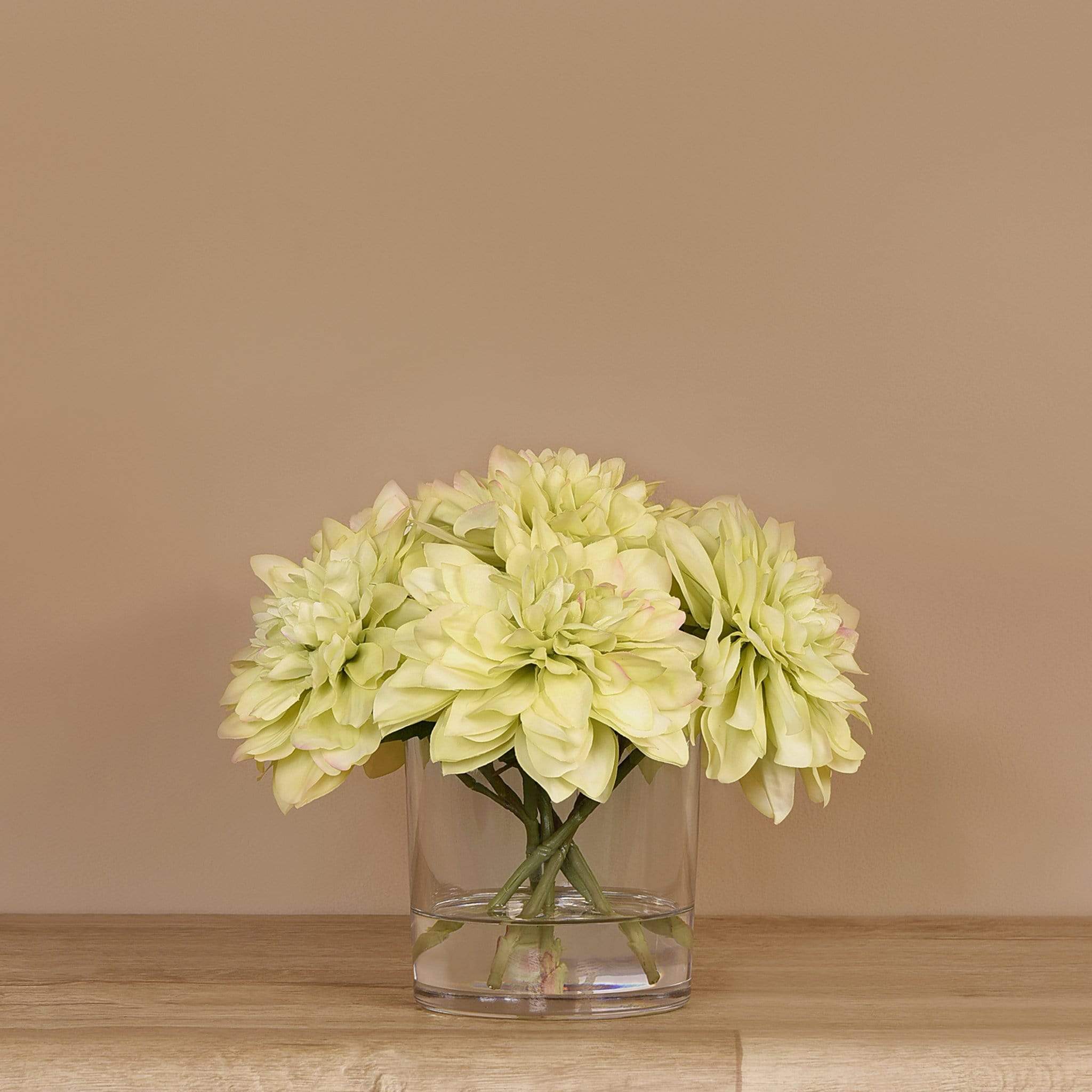 A symbol of elegance and grace, these delicate dahlias make any living space look even more sophisticated. Hand-arranged by expert florists, these faux flowers are placed in a simple glass vase for a highly realistic look.