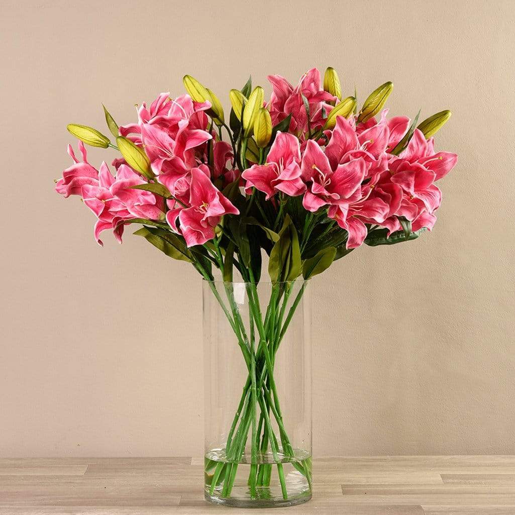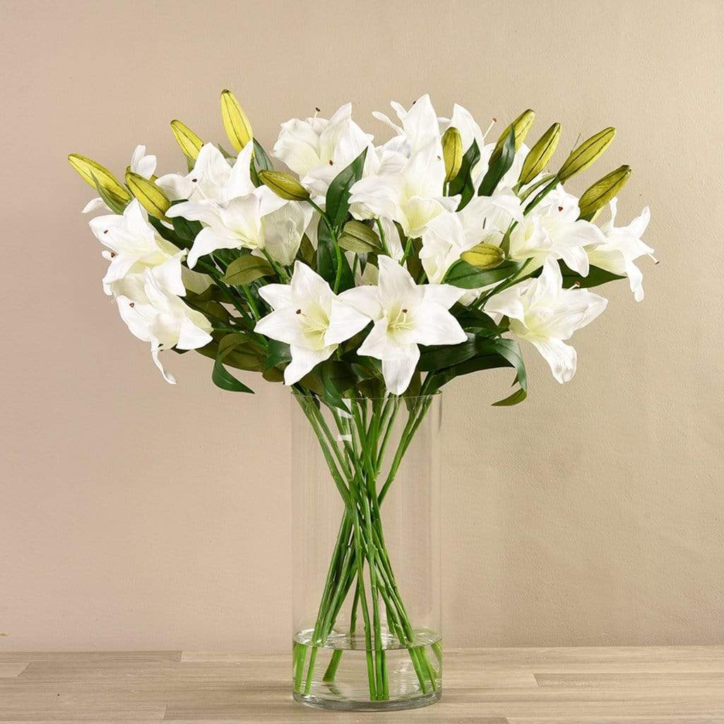 A universal symbol of purity and rebirth, this beautiful artificial lily arrangement is sure to invite more peace and tranquility into your home. These hand-designed faux flowers look and feel remarkably real. Their tall glass vase accentuates their long stems.
