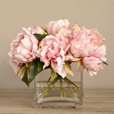 These gorgeous artificial peonies add a feminine touch to any space. Handcrafted from the finest materials, these white florals look as real as natural peonies. Their circular glass vase perfectly contrasts against the soft textured blooms.