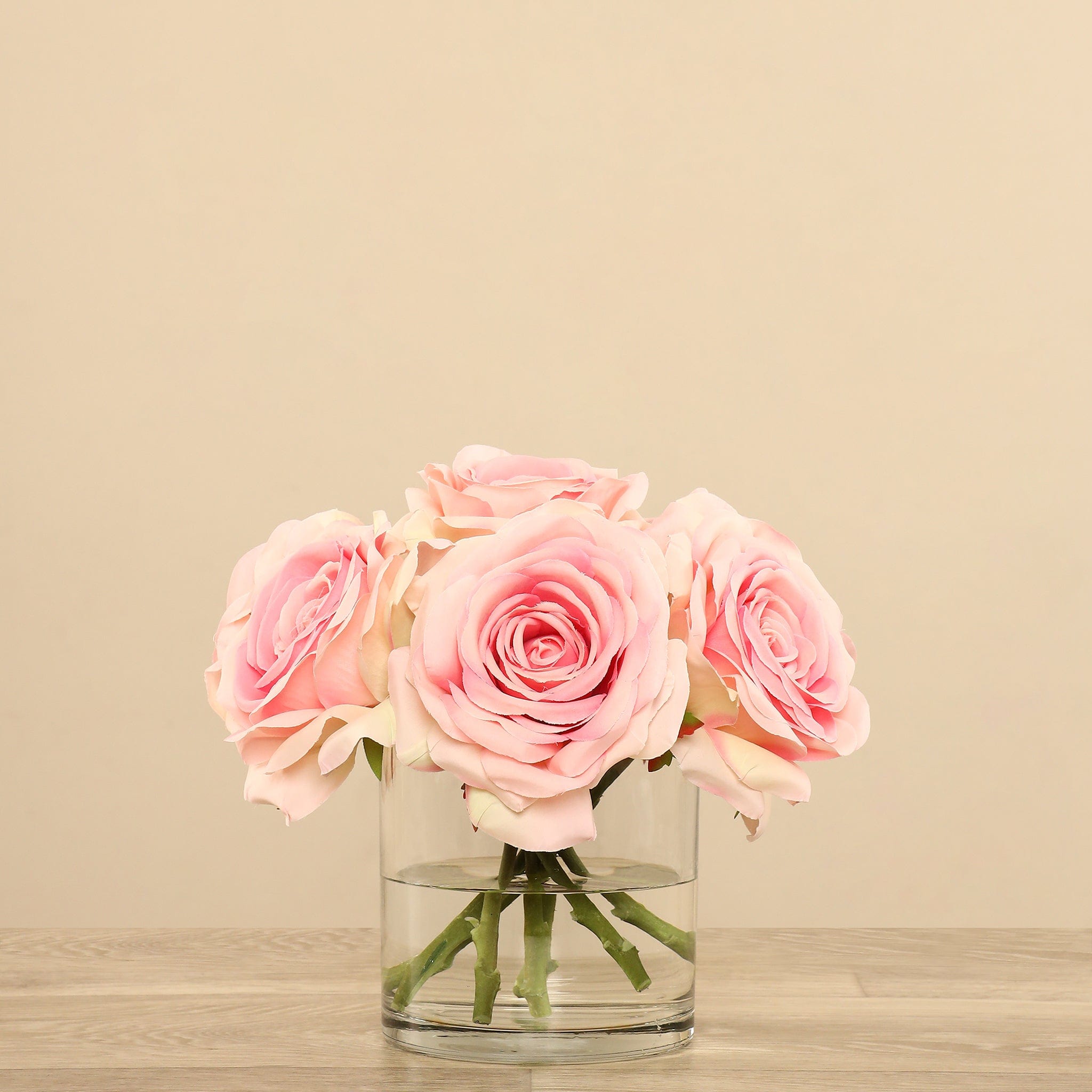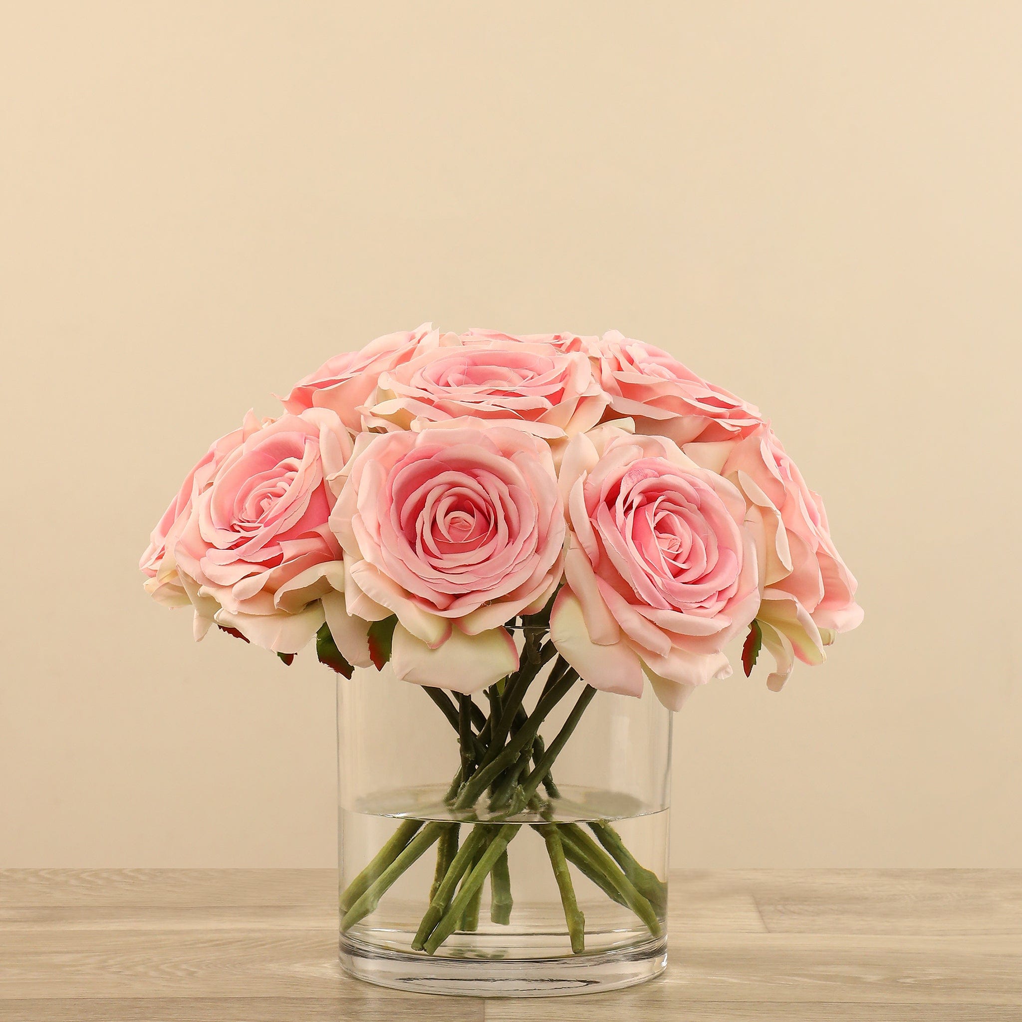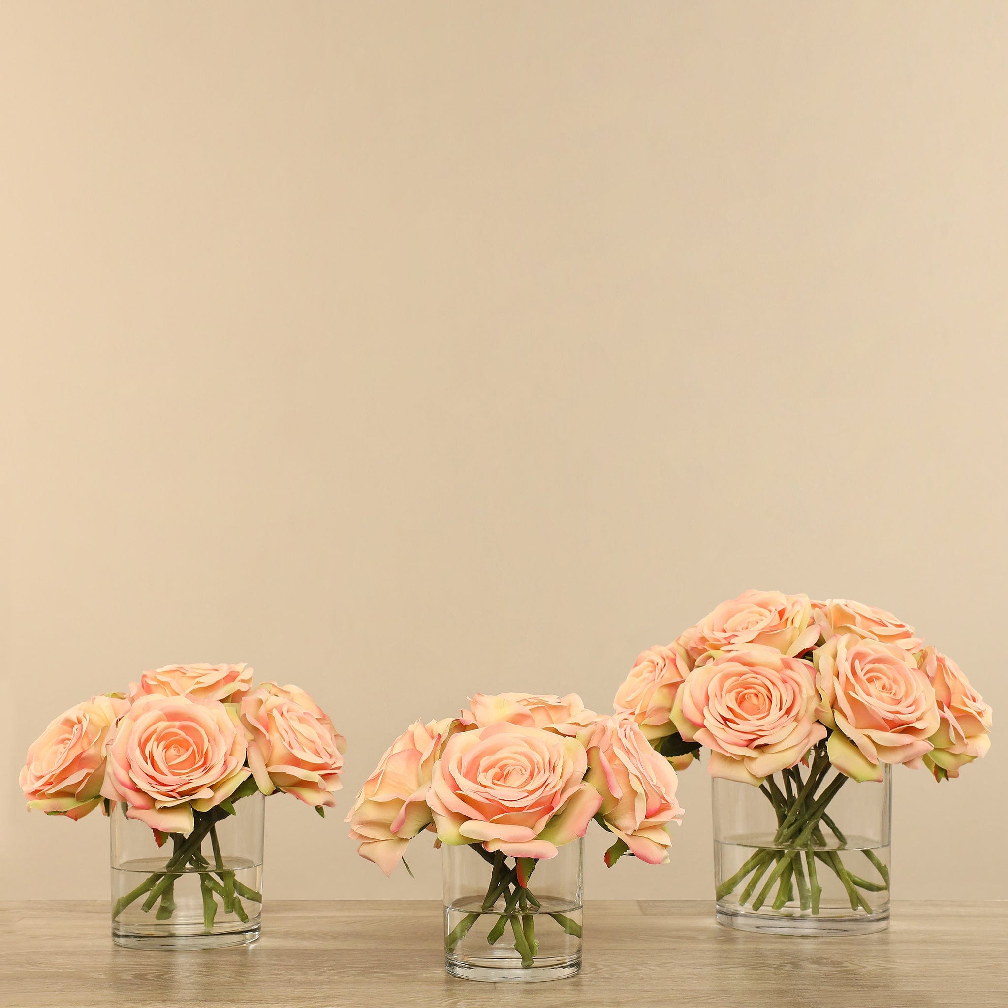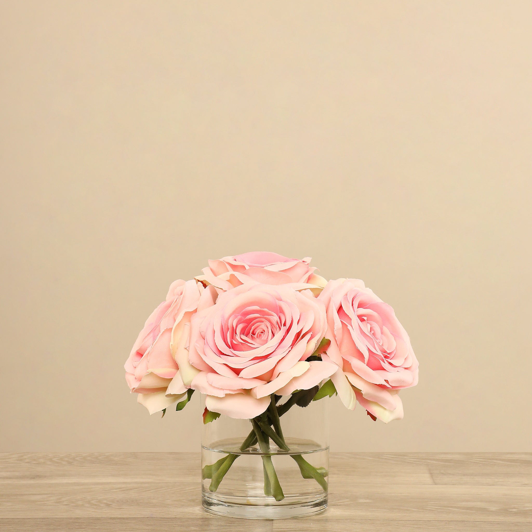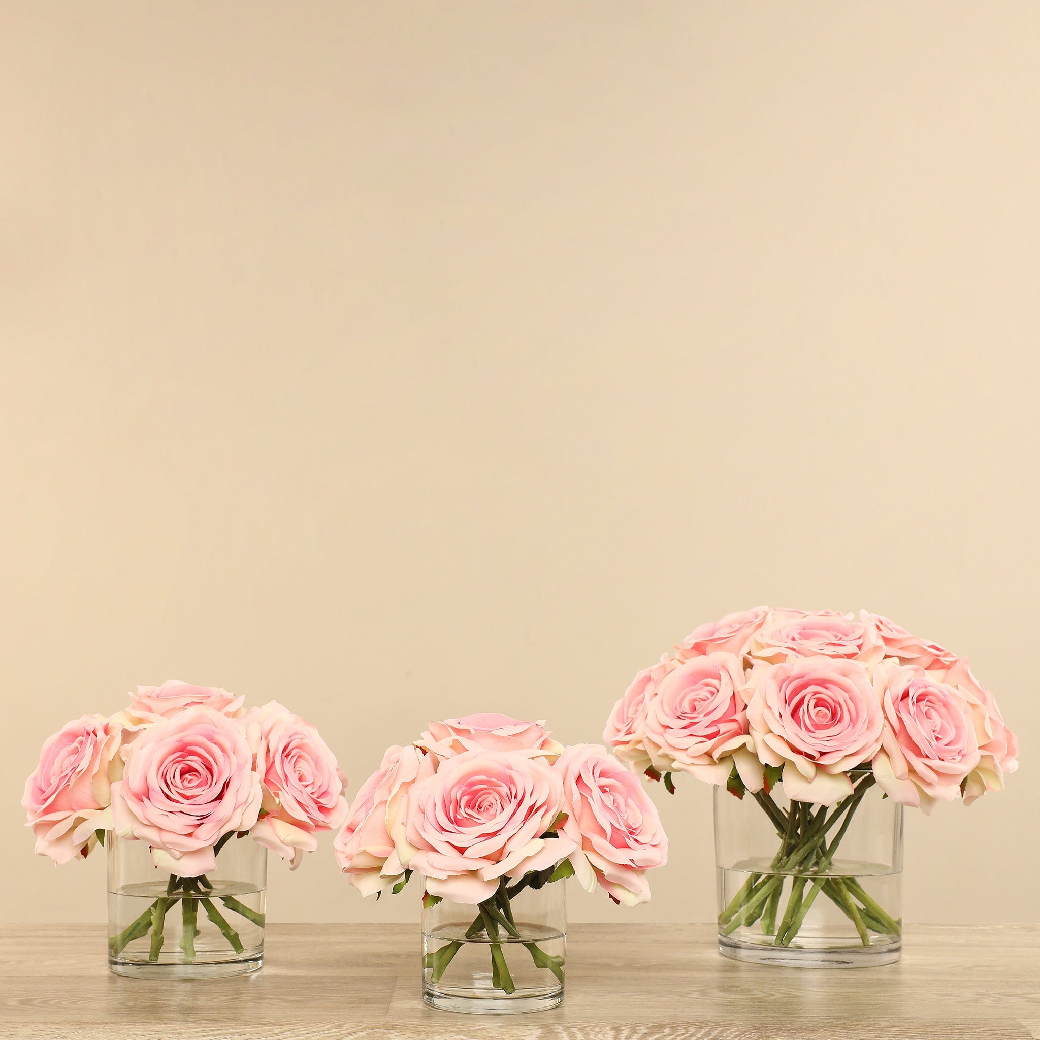 A universal symbol of love and passion, these roses will surely beautify any living space. Their light pink silk petals and green stems look remarkably real set in a delicate glass vase.