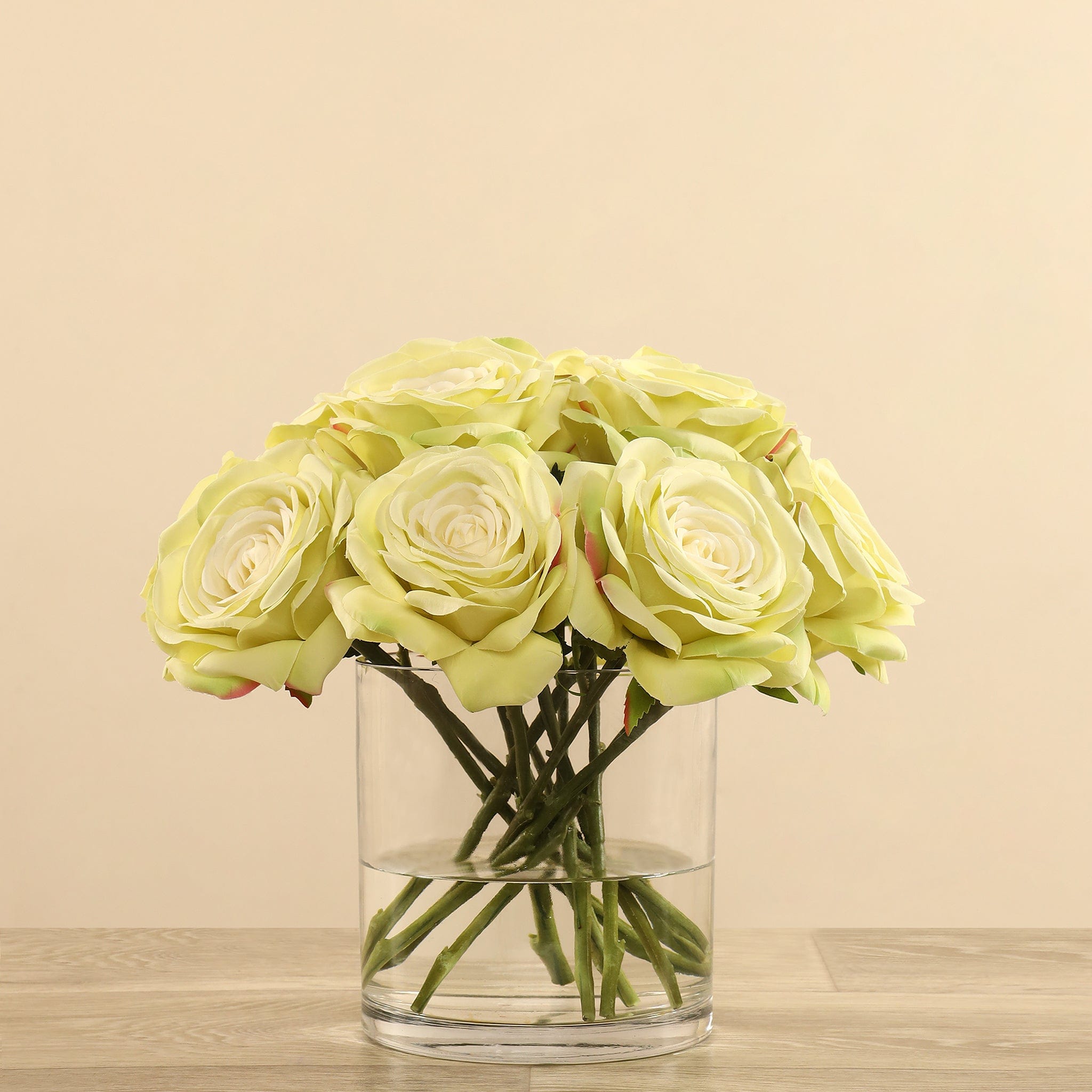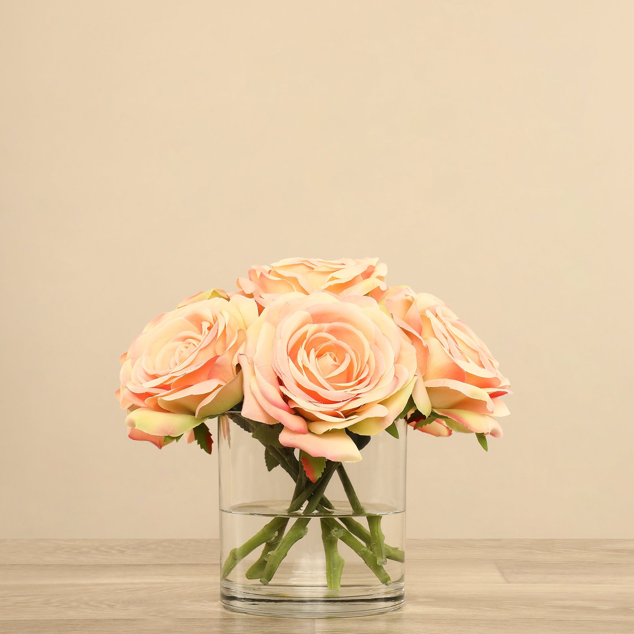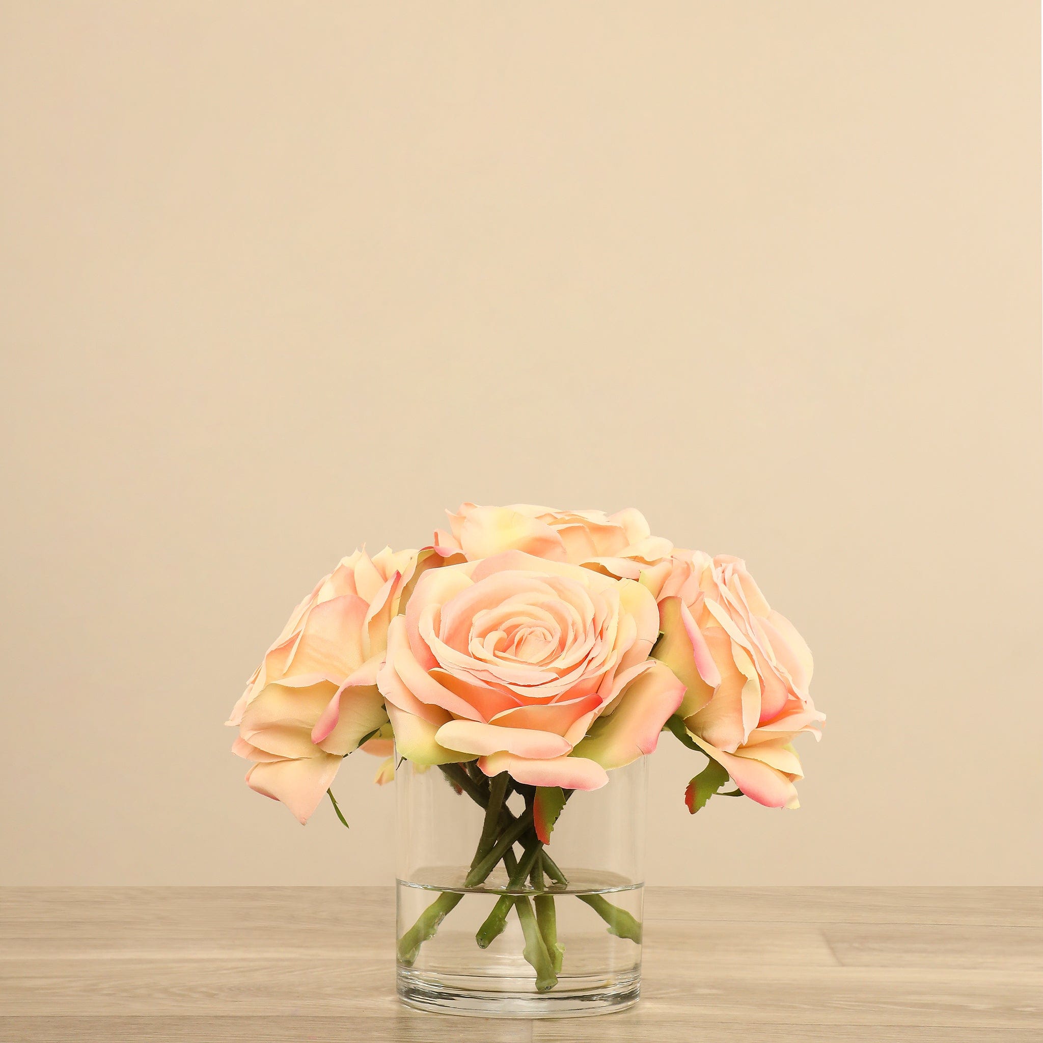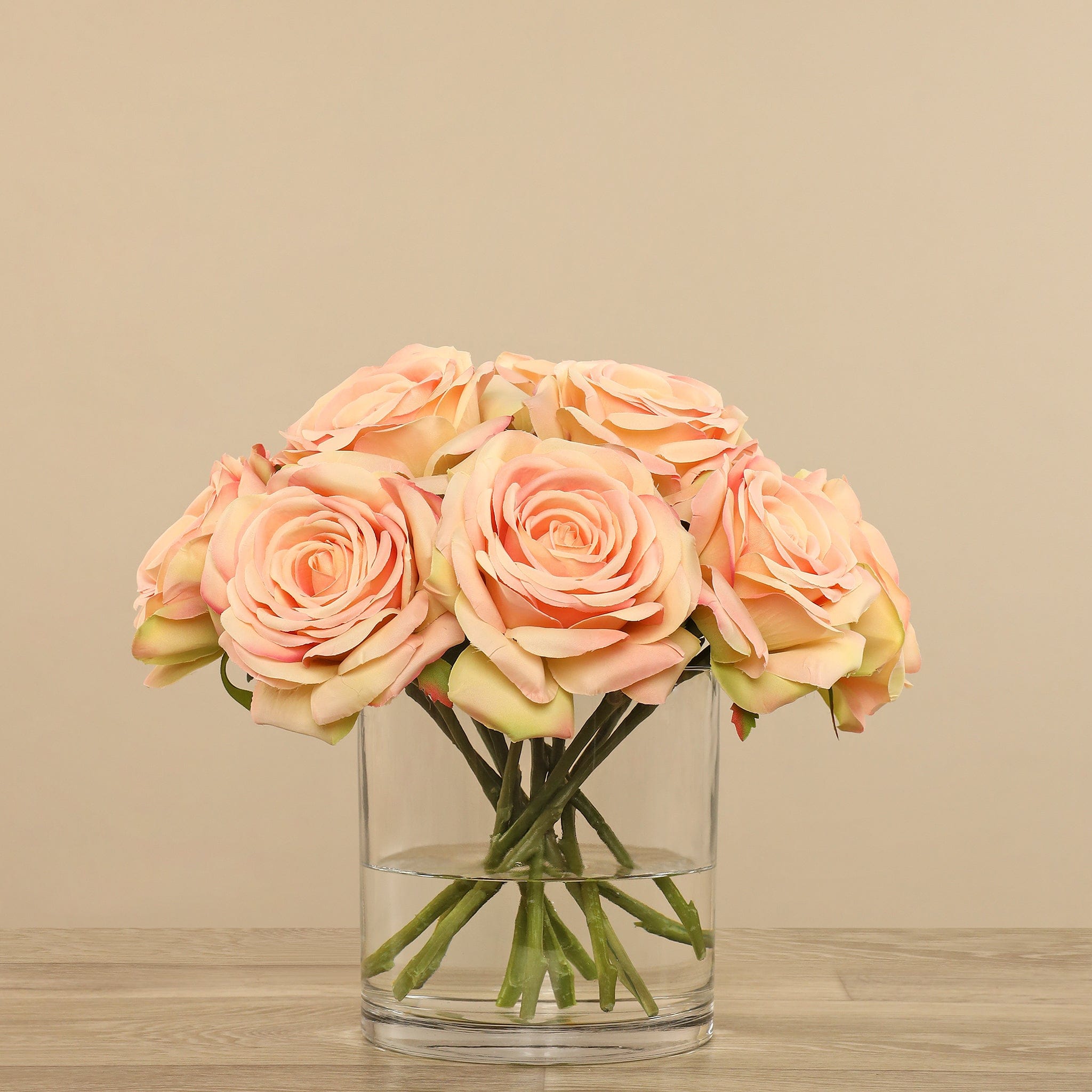 A universal symbol of love and passion, these roses will surely beautify any living space. Their light pink silk petals and green stems look remarkably real set in a delicate glass vase.