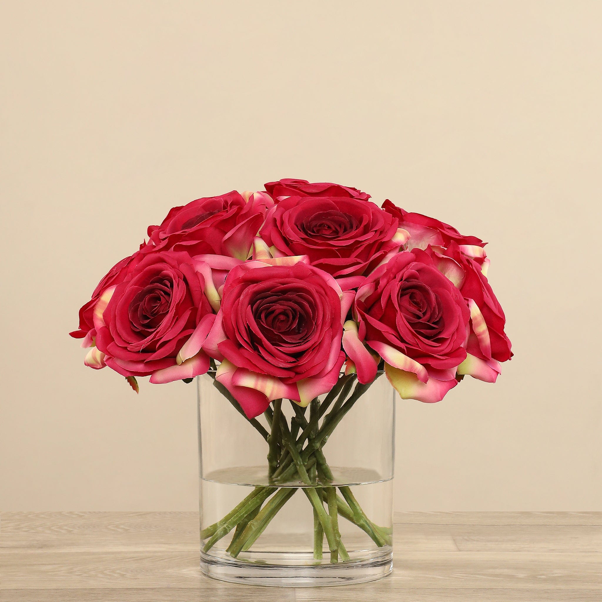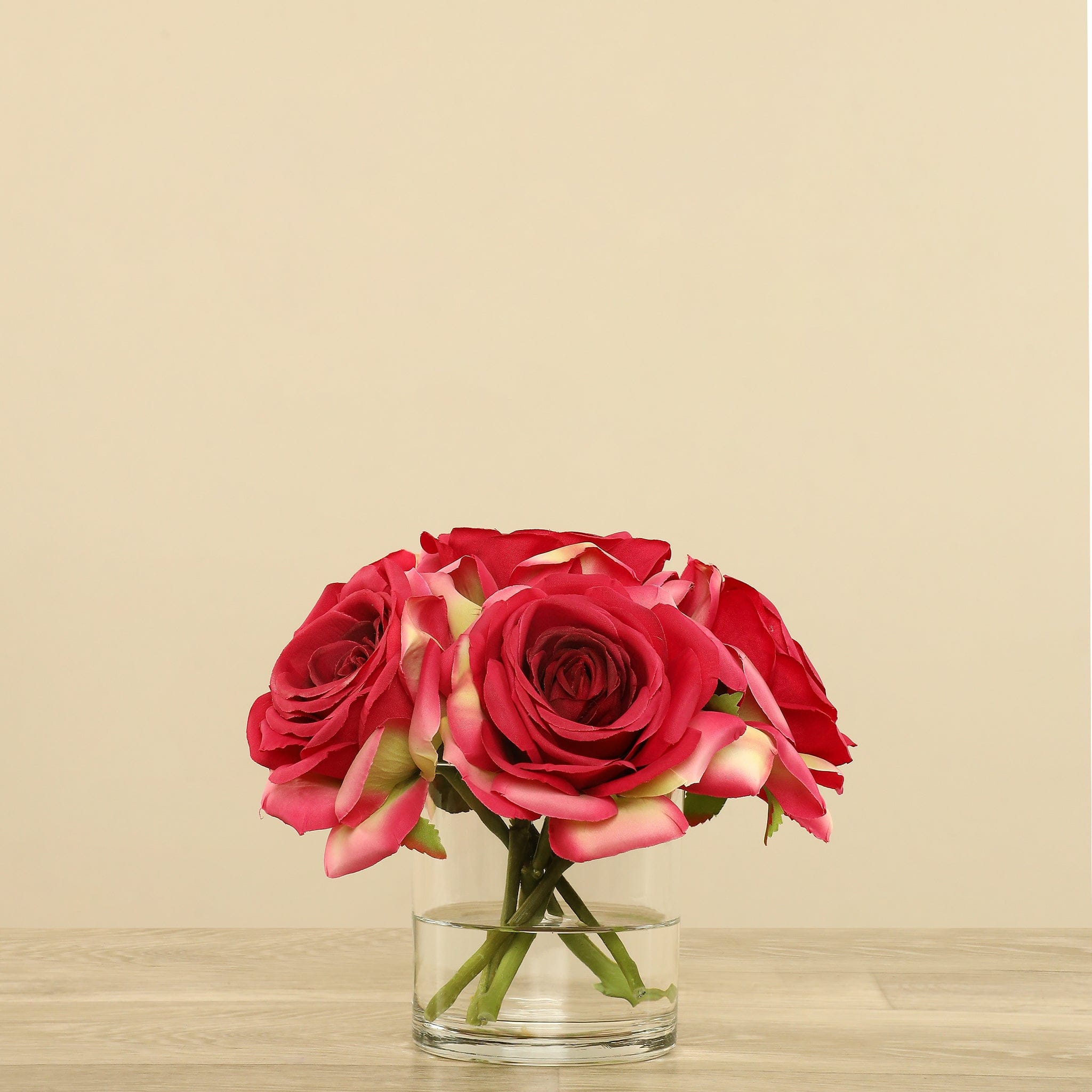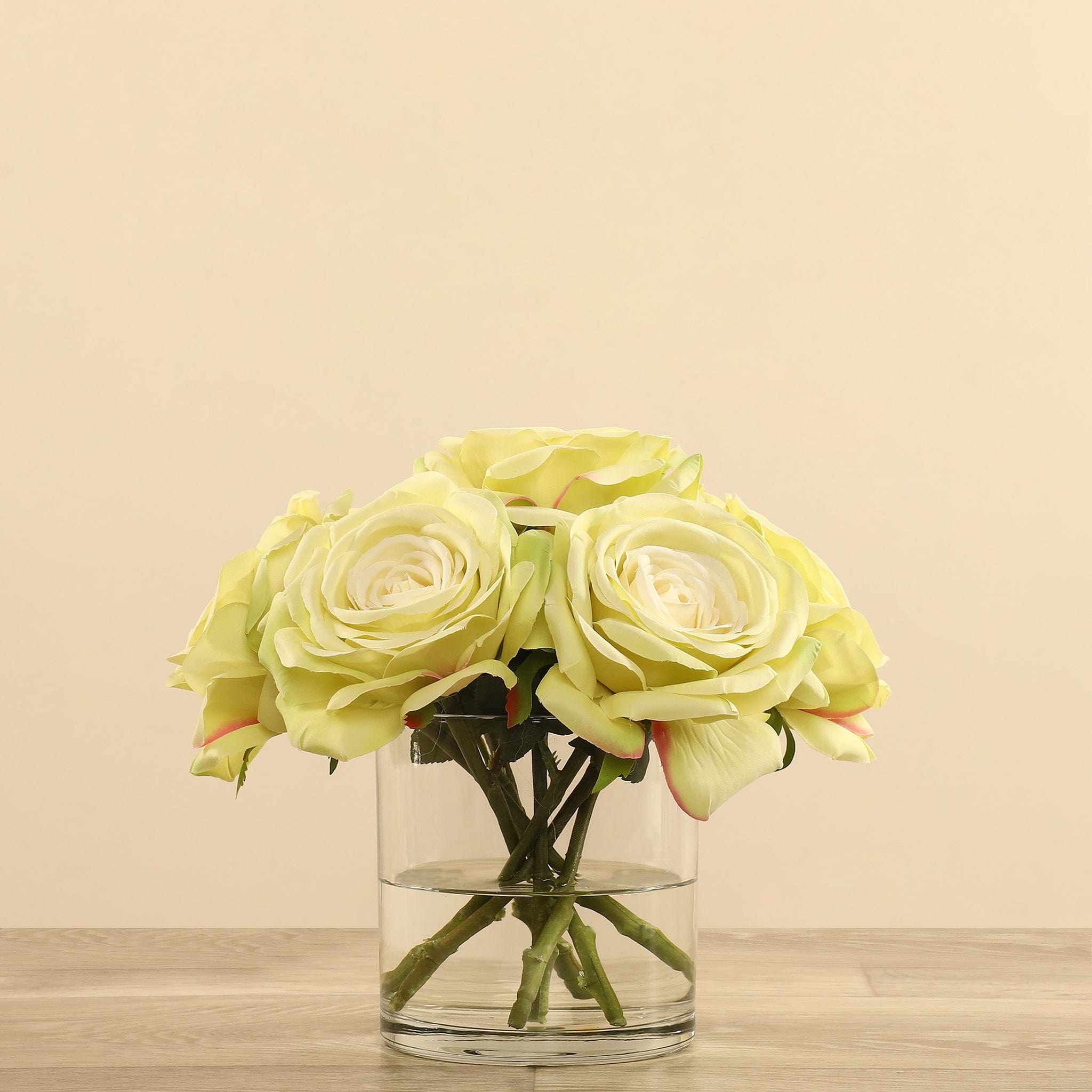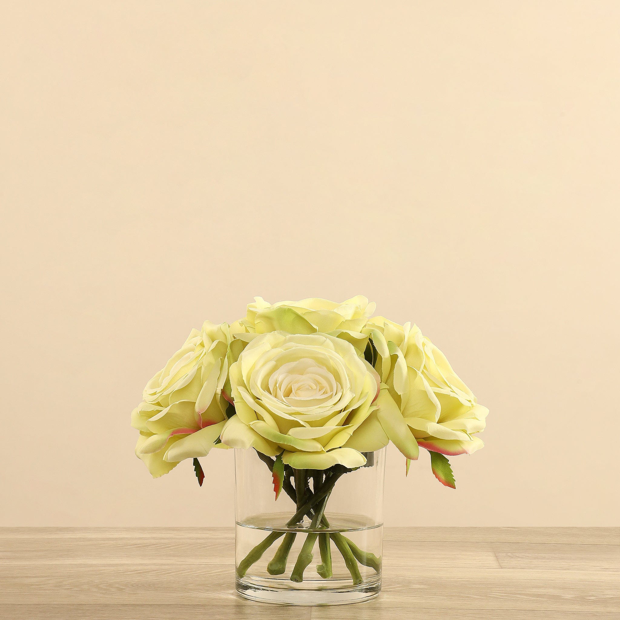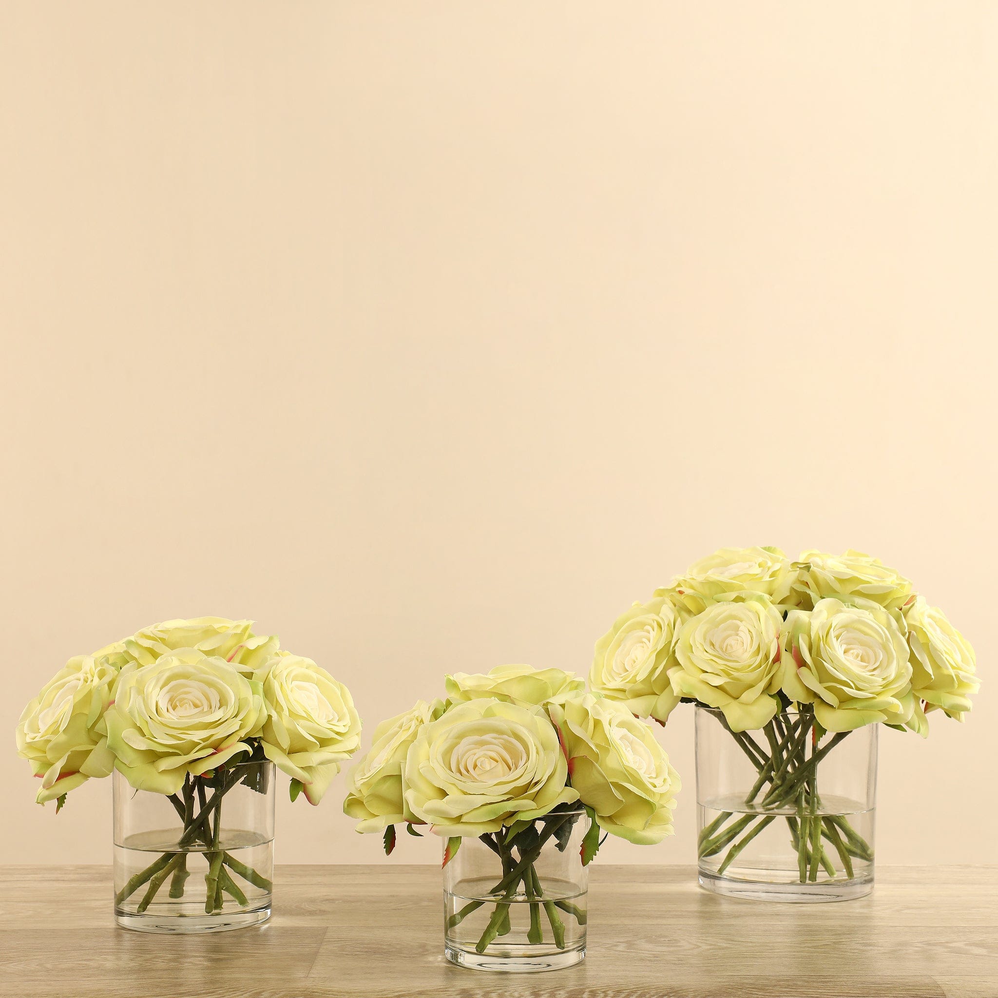 A universal symbol of love and passion, these roses will surely beautify any living space. Their light pink silk petals and green stems look remarkably real set in a delicate glass vase.