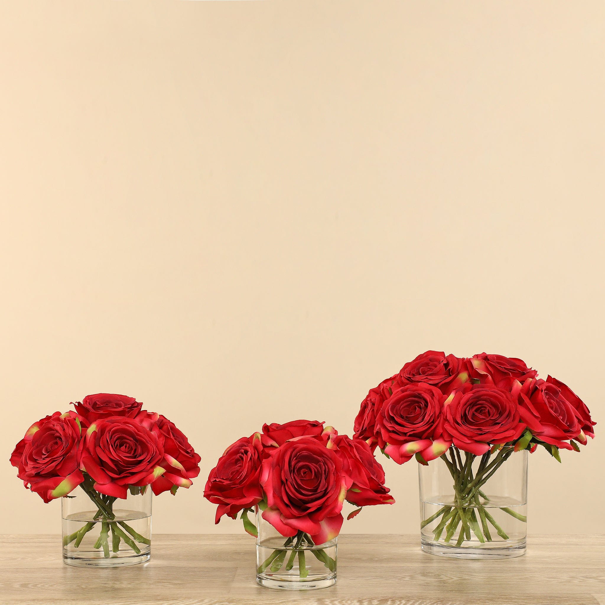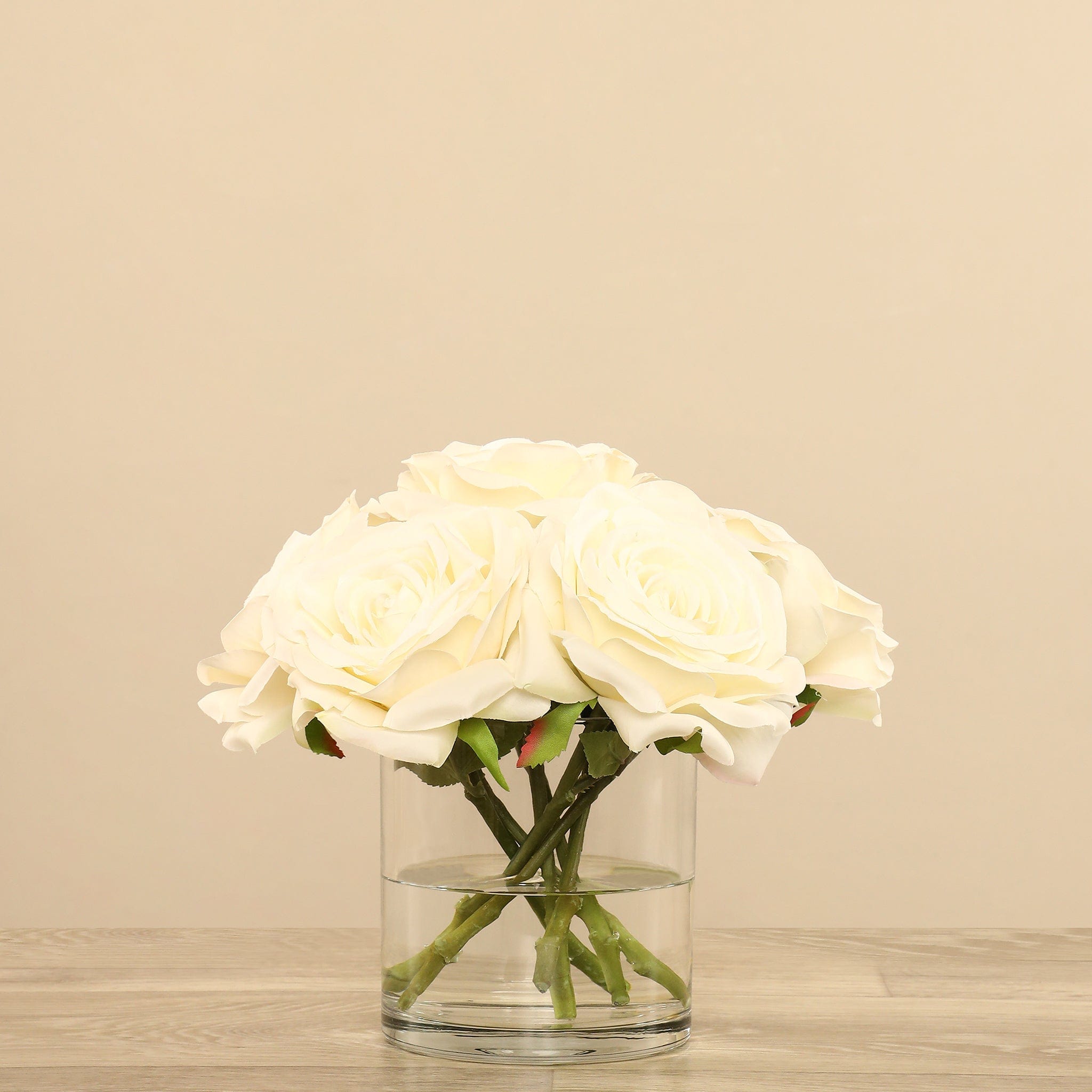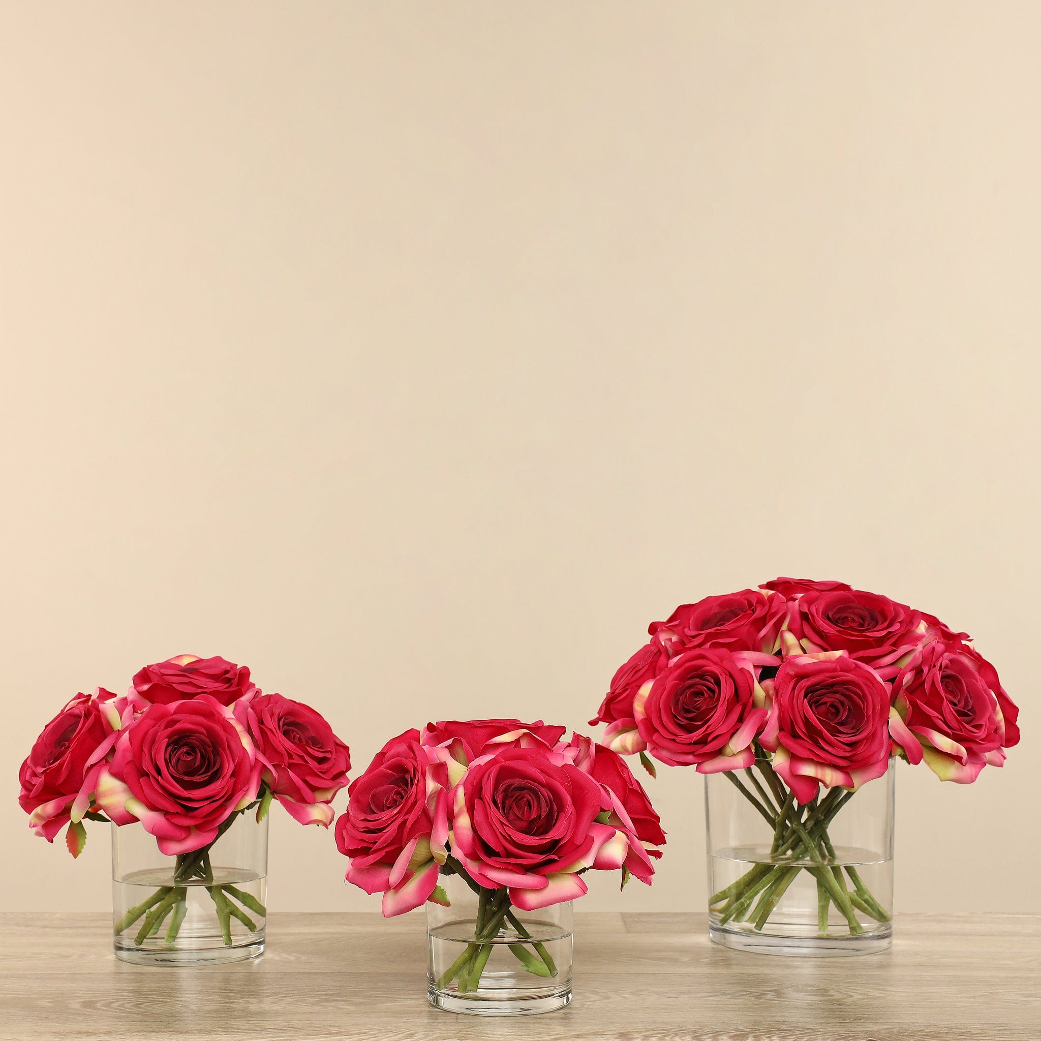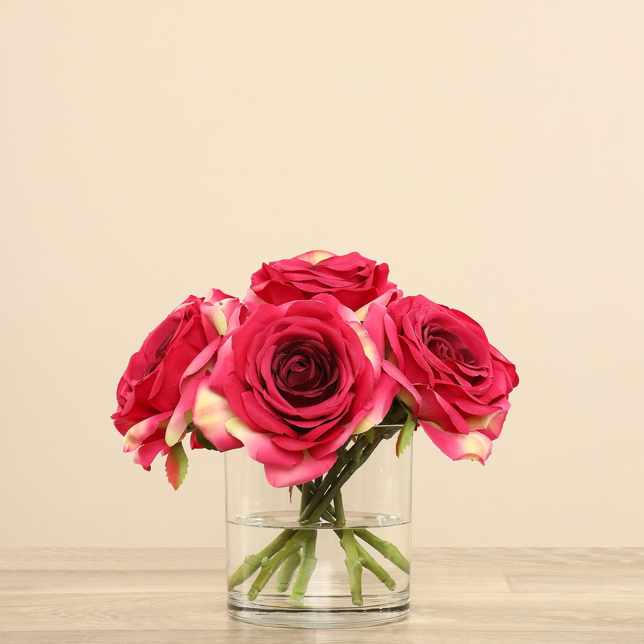 A universal symbol of love and passion, these roses will surely beautify any living space. Their light pink silk petals and green stems look remarkably real set in a delicate glass vase.