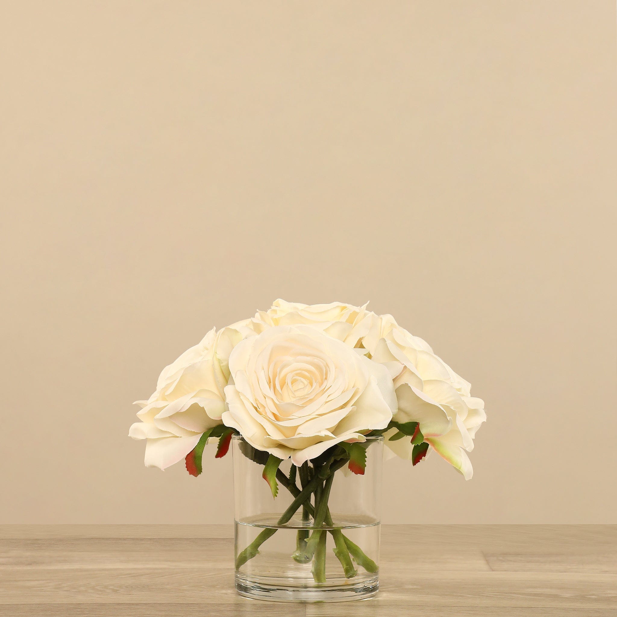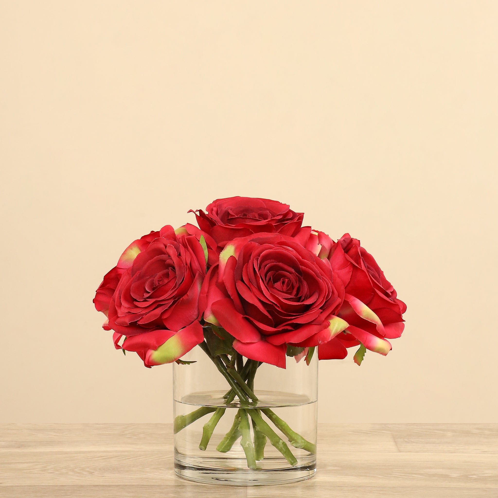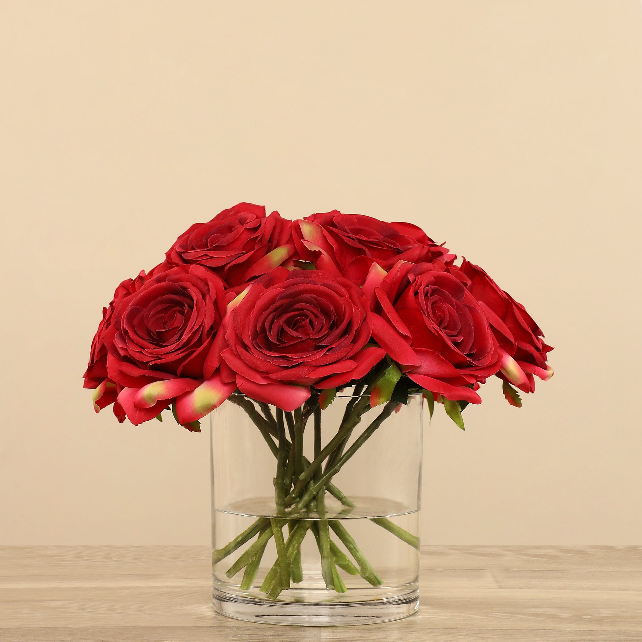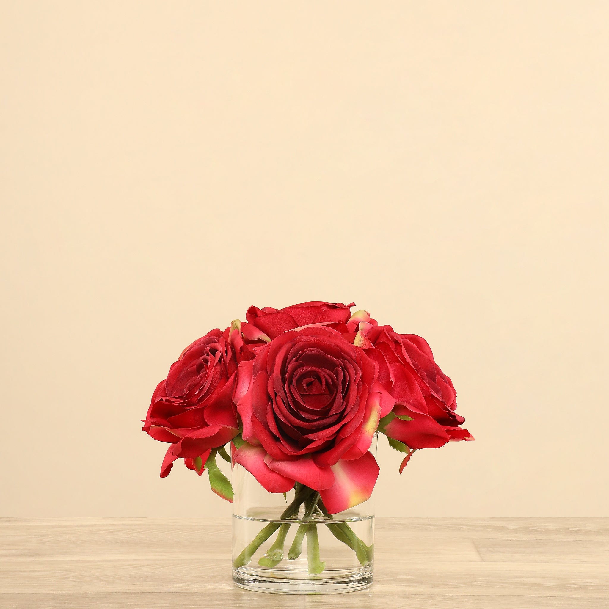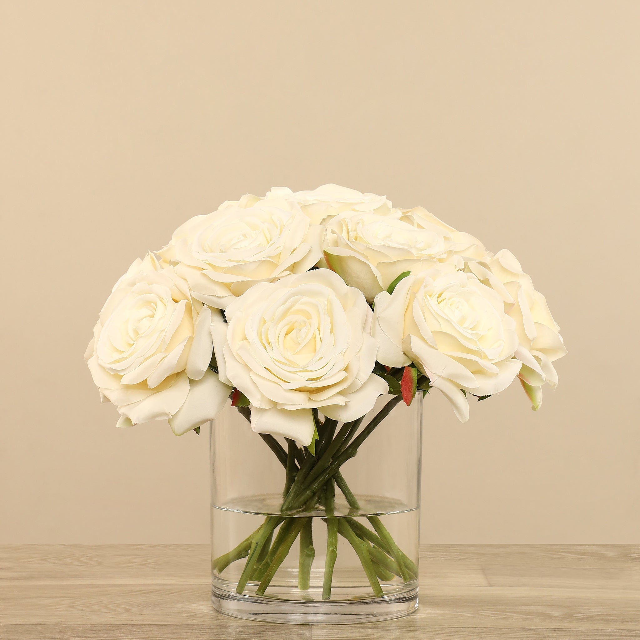 A universal symbol of love and passion, these roses will surely beautify any living space. Their light pink silk petals and green stems look remarkably real set in a delicate glass vase.