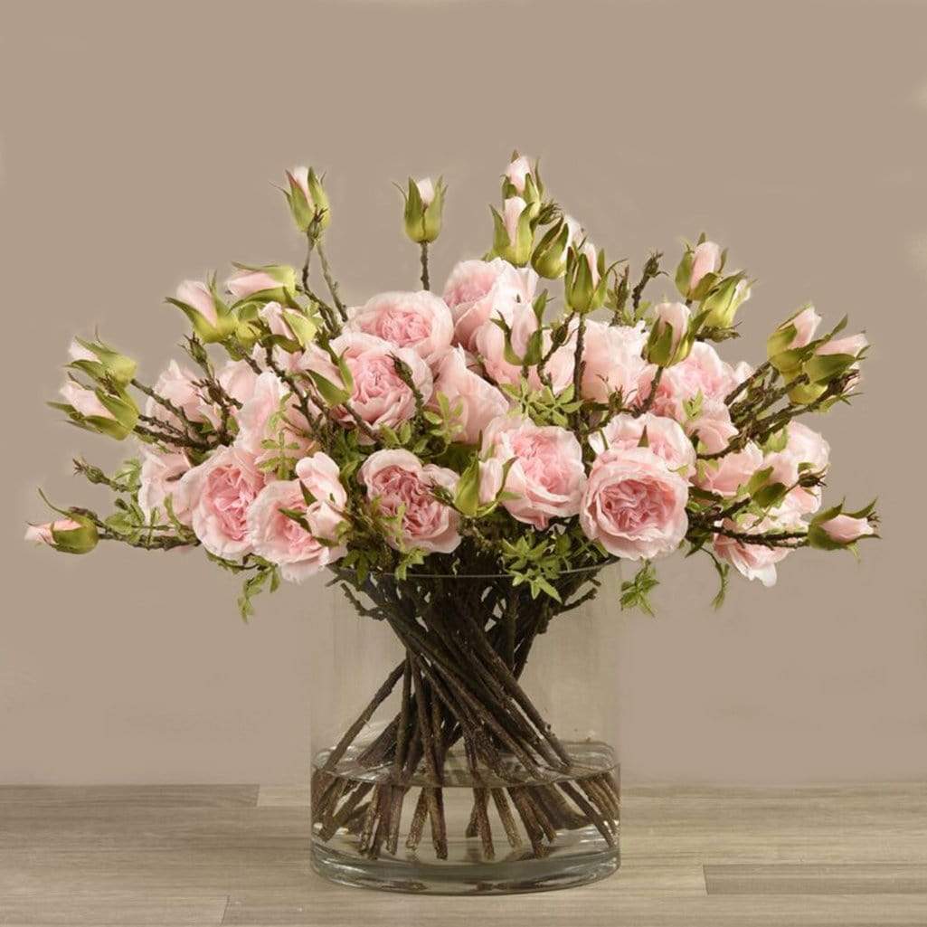 These roses have such a fresh, romantic look. Hand-designed by expert florists, these artificial roses feel completely real to the touch. Their wide-rimmed glass vase accentuates elegant long stems.