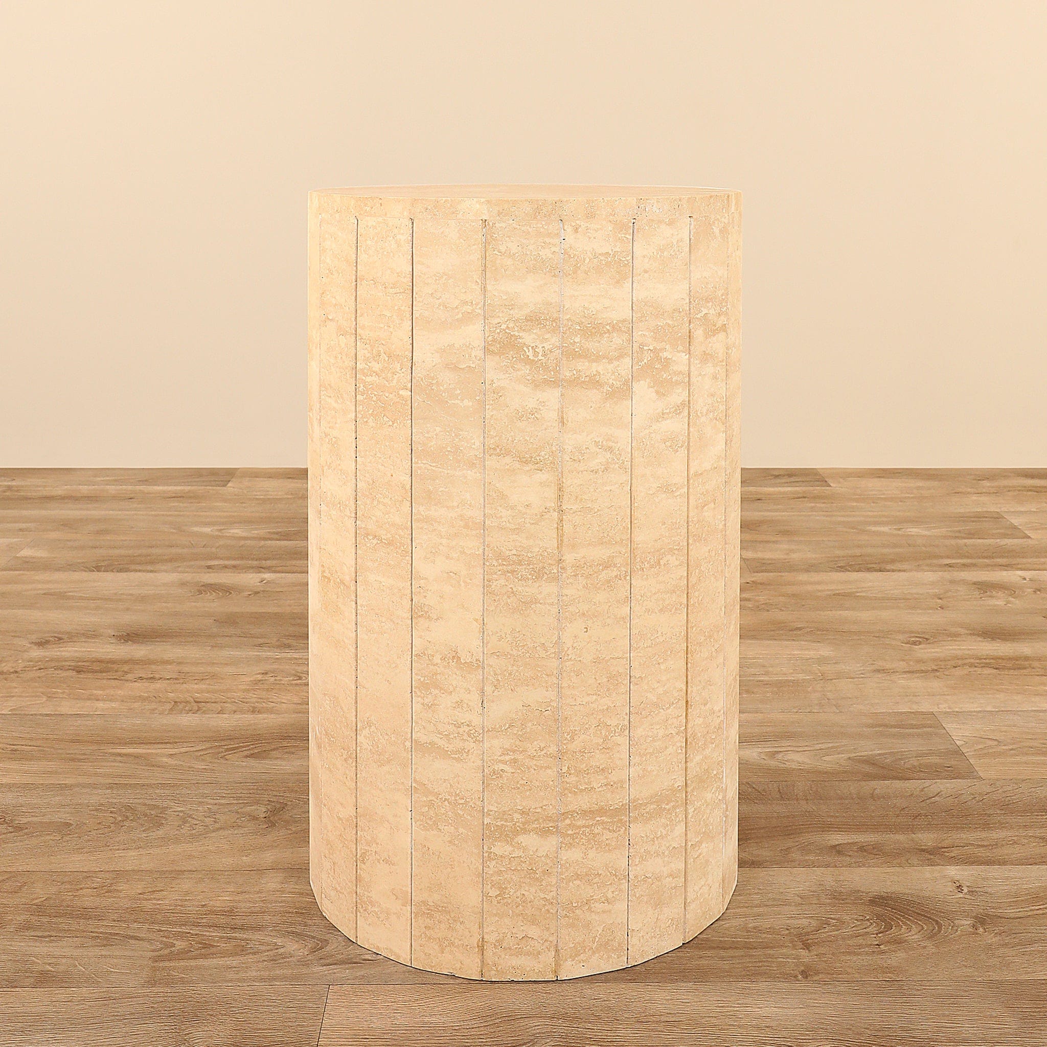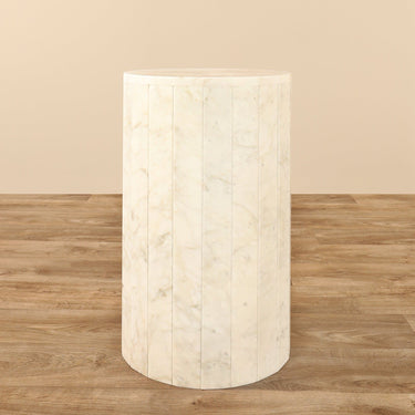 Simply formed this marble side table is a study in understated elegance. Fashioned in natural marble this contemporary side table is a simple cylinder for a minimalist style. Bold and solid it will lend elemental style to a space.