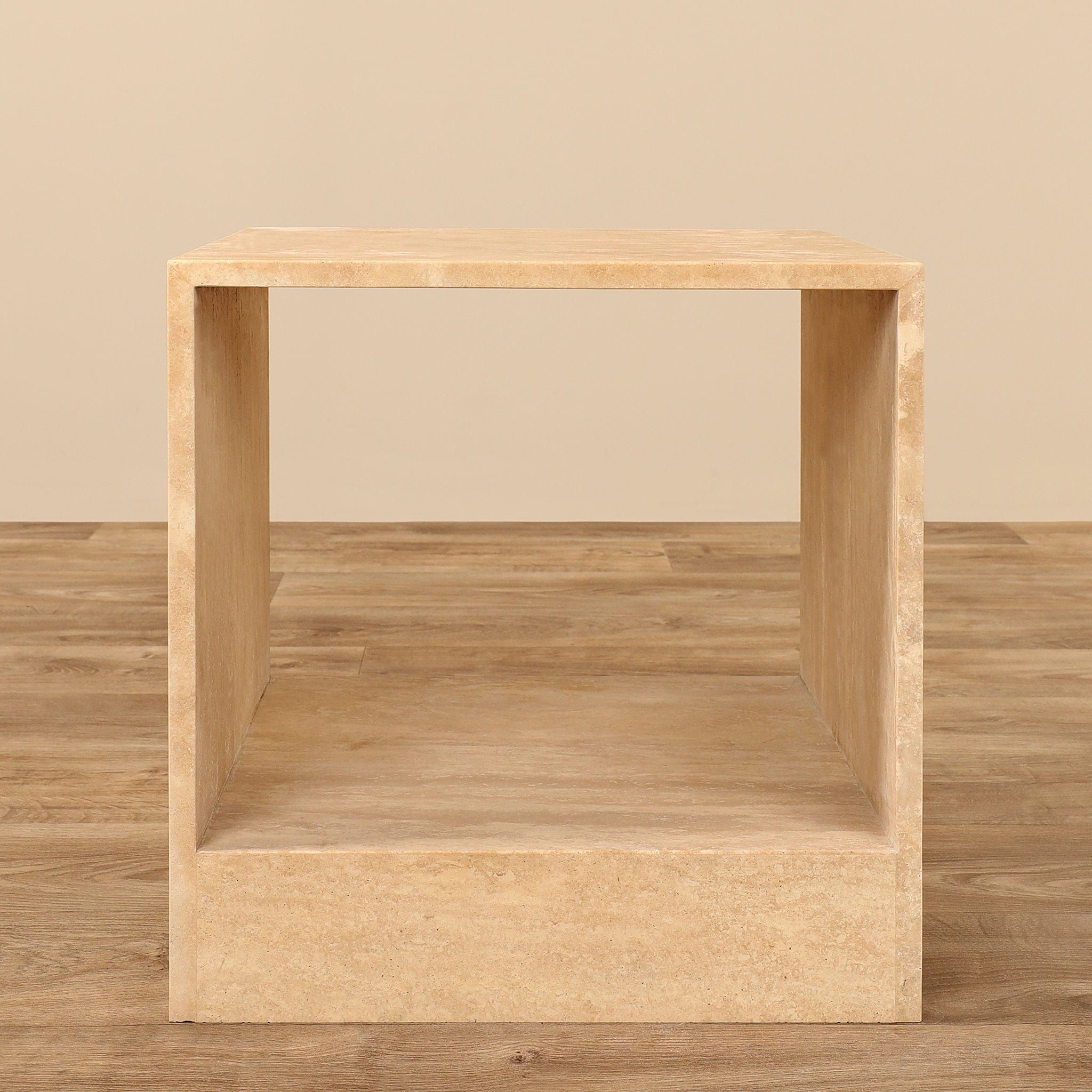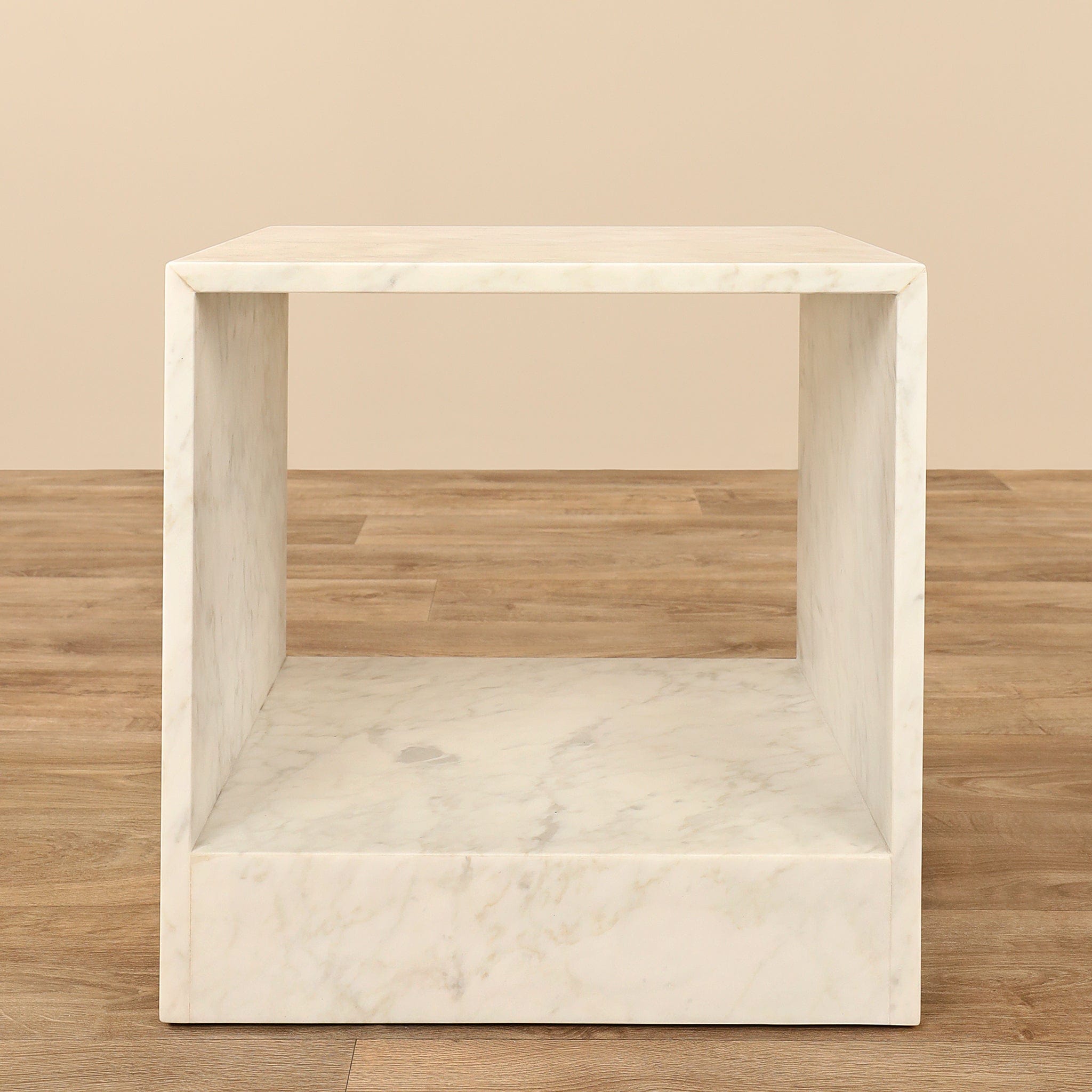 Clean lines and the beauty of natural marble take humble to new heights on the Beatrice side table. Beautifully veined this piece is designed to show off the natural beauty of marble while adding practical space in a living area. It has a spacious surface area and an open design for storage.