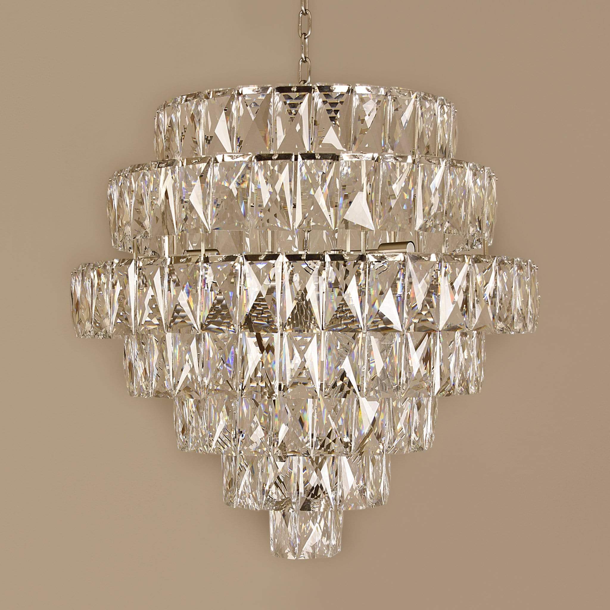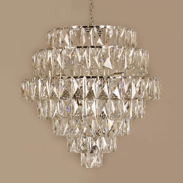 This chandelier boasts an elegant design featuring seven tiers that evoke intrigue and a sense of theatricality. Meticulously fashioned using faceted glass pieces to capture and scatter light with exquisite refraction, this chandelier stands as a masterpiece, ideally suited for an elegant and sophisticated environment.