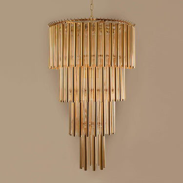 Wonderfully elegant this contemporary glass and metal chandelier is reminiscent of a beautiful wind chime and it is finished in rich gold. The four-tier style is certain to lend drama and interest to a foyer or dining room.