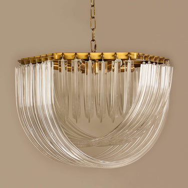 A gleaming brass finish and sparkling clear glass attract attention to this contemporary chandelier. Ideal for wonderful illumination over a dining table, this sophisticated chandelier could also be used in a living space or front entryway to greet guests.