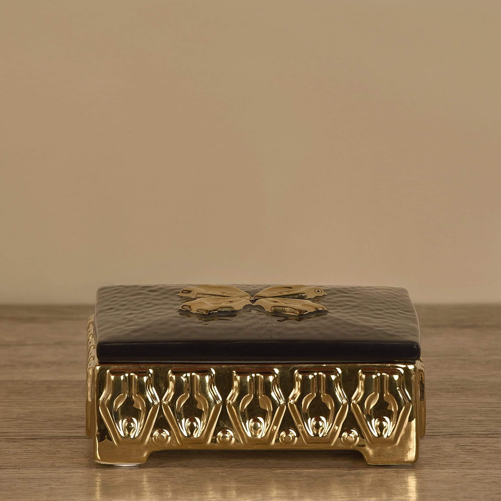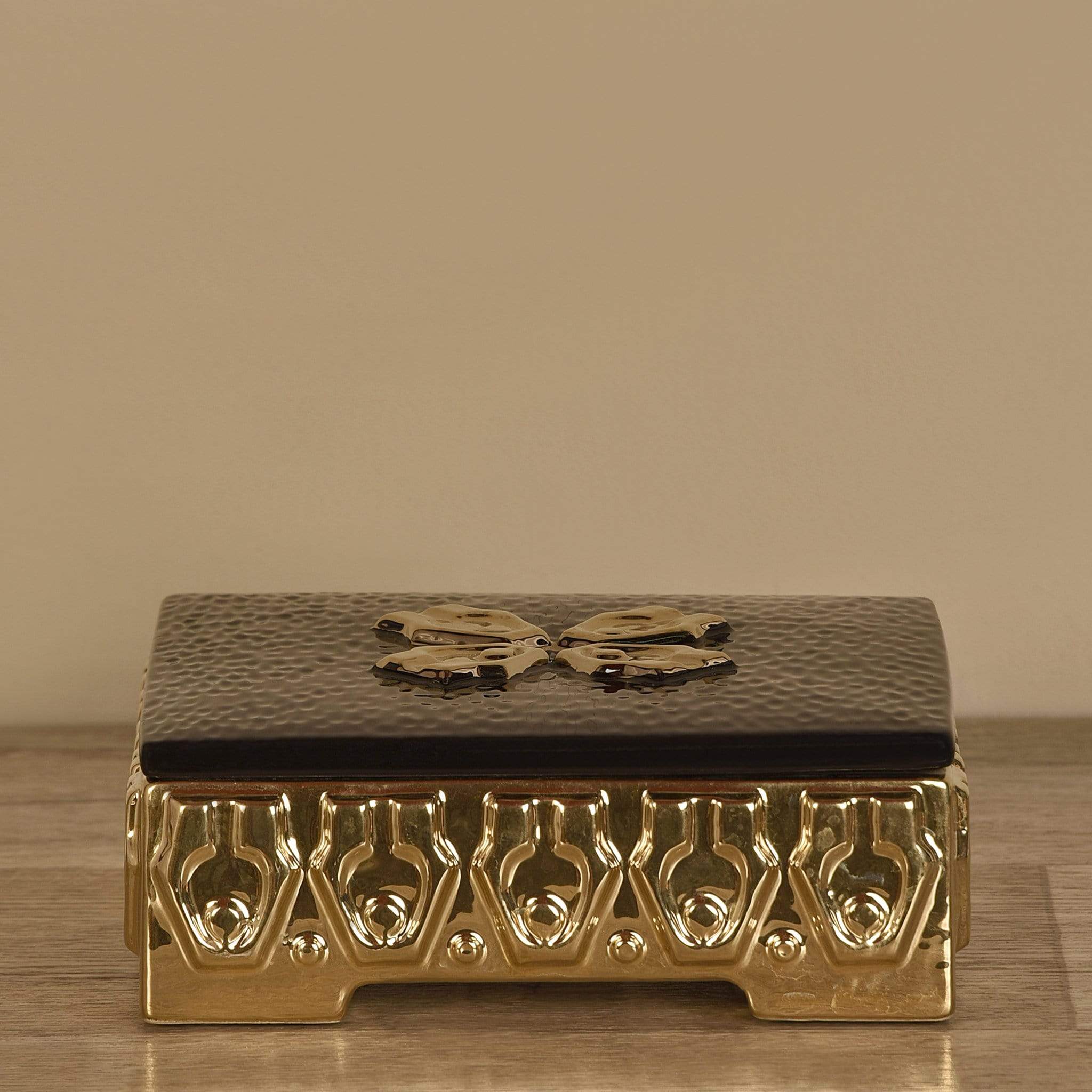A dainty box fit for the prettiest treasures. Made from high-quality ceramic, this rectangular box features a removable lid and a contrasting metallic gold handle. Keep it in your bathroom or bedroom.