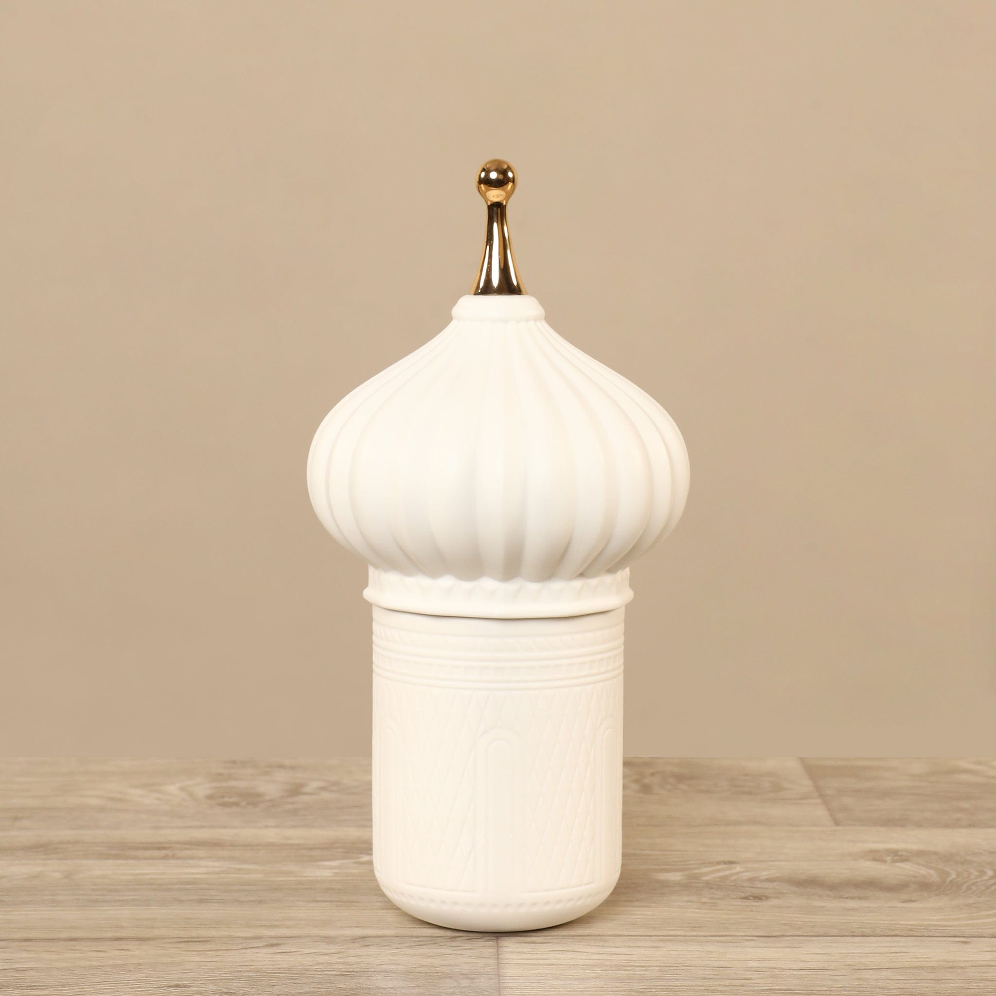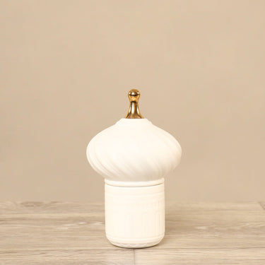 Borrowing inspiration from Moroccan architecture this elegant ceramic jar makes a wonderful choice for display on a shelf, mantel, or coffee table. Its teardrop-shaped lid is complemented by a gold-finished knob completing the look of this sophisticated piece perfectly.
