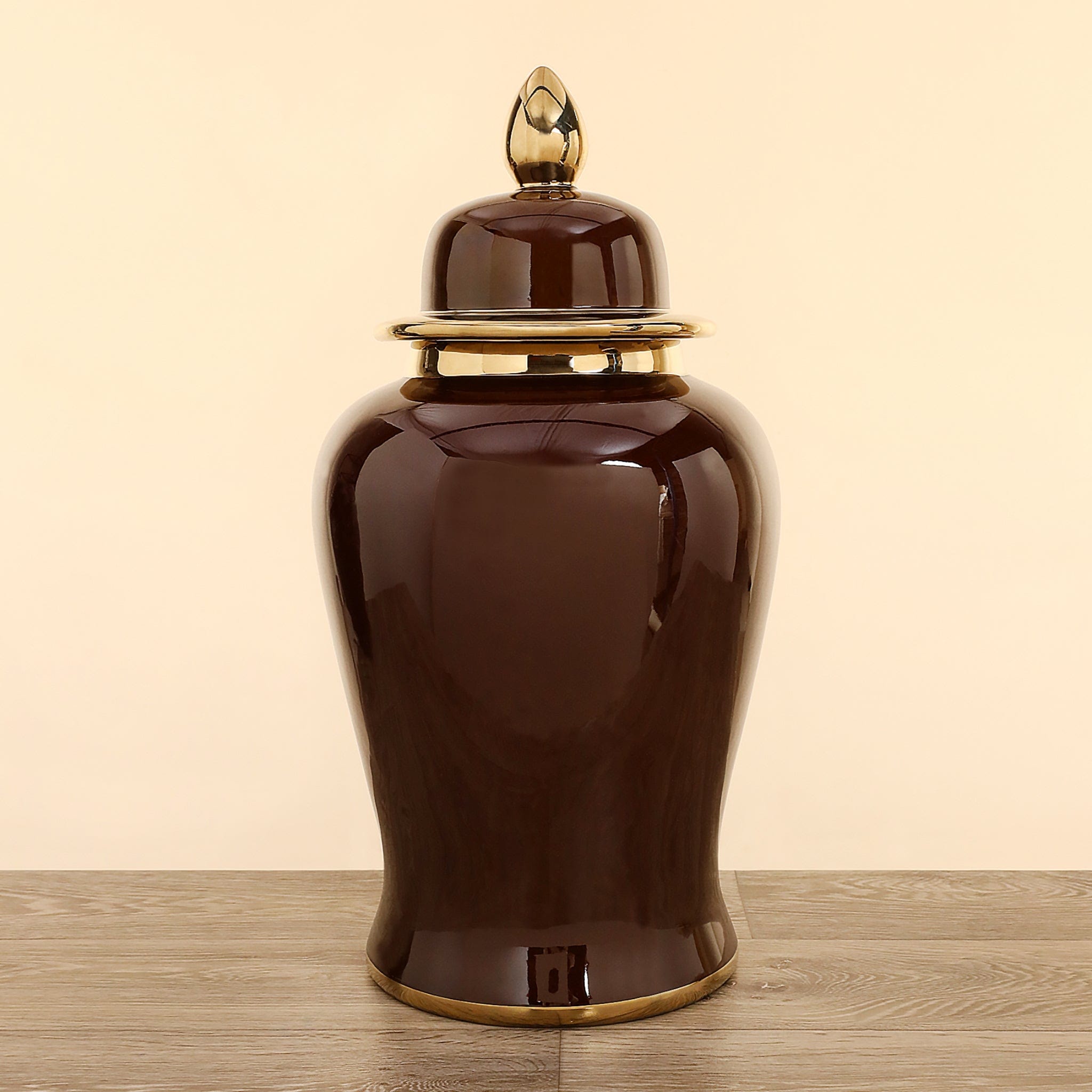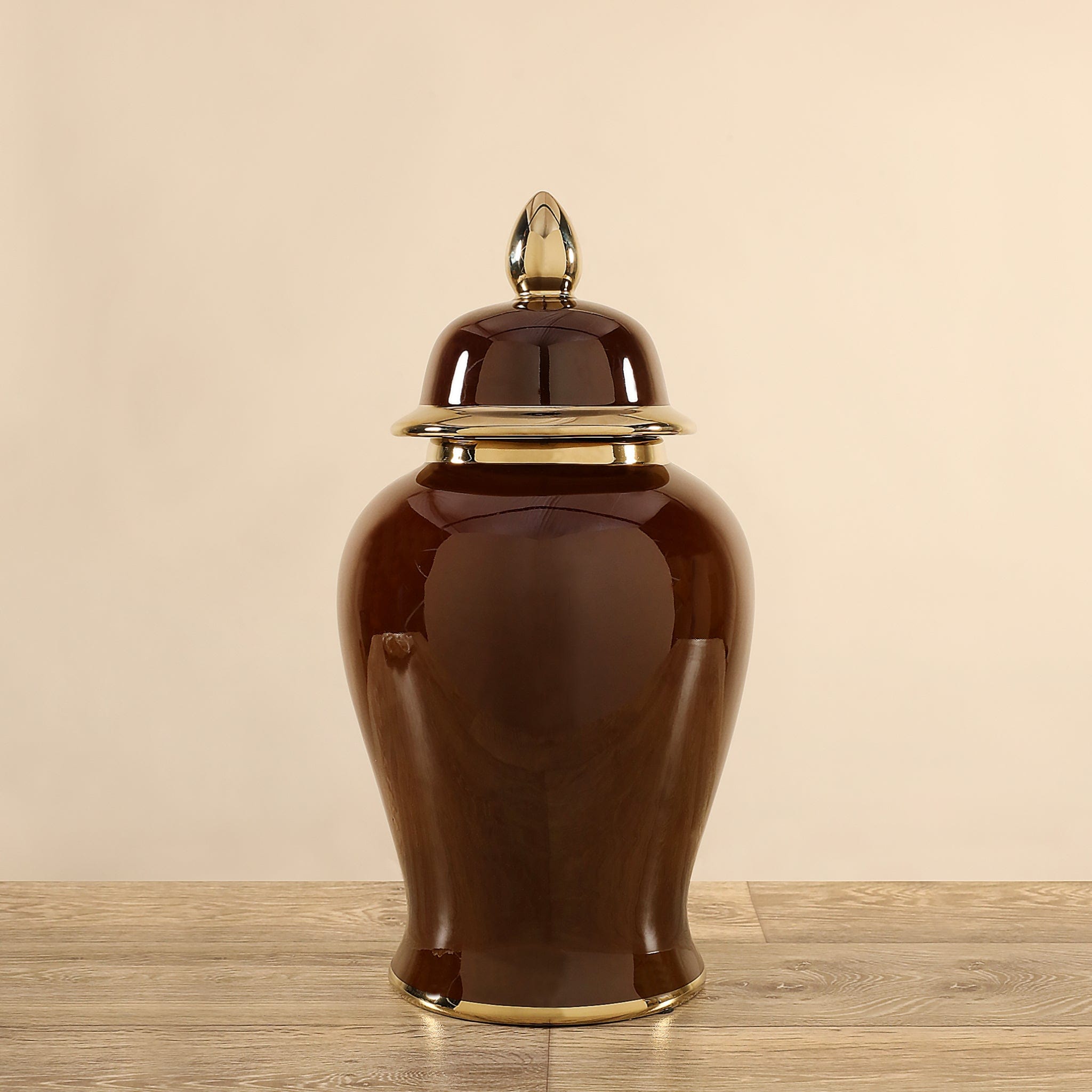 The classic ginger jar style gets a modern update with a rich shade of chocolate brown with gleaming gold trim. Perfect for display on a shelf or mantel this elegant ceramic jar could also be used as a vase to hold a floral bouquet.