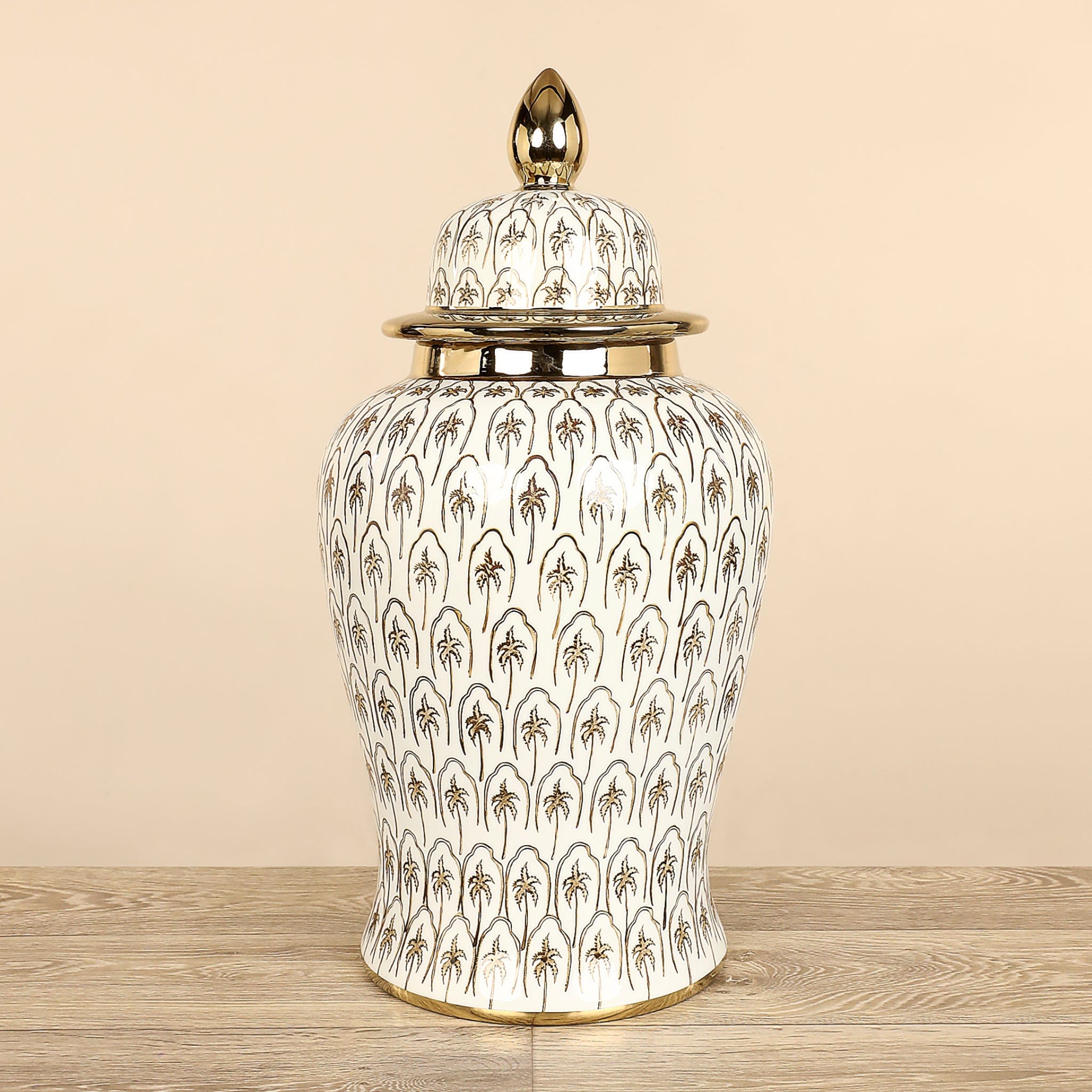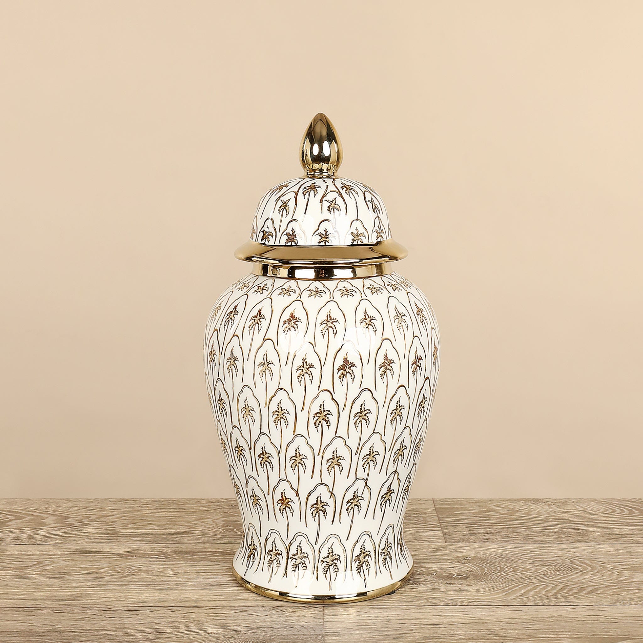 Borrowing inspiration from Moroccan architecture this elegant ceramic jar makes a wonderful choice for display on a shelf, mantel, or coffee table. Its teardrop-shaped lid is complemented by a gold-finished knob completing the look of this sophisticated piece perfectly.