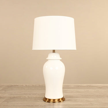 This ginger jar-inspired lamp is a charming and practical piece to meet your fashion lighting needs. It features a white curvy-shaped ceramic base, shining gold finish trim, and coordinating fabric shade. Perfect for the living room, bedroom, or office, this lamp is sure to satisfy both your décor and lighting needs for your home or office.