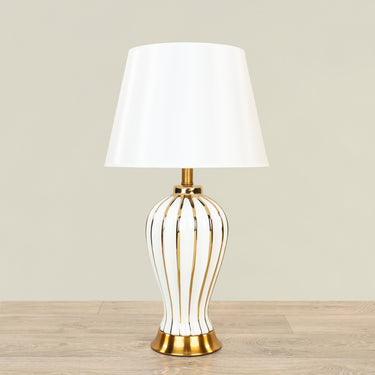 Crafted from premium ceramic in pristine white, this sophisticated lighting piece features elegant gold line detailing that catches the light beautifully.