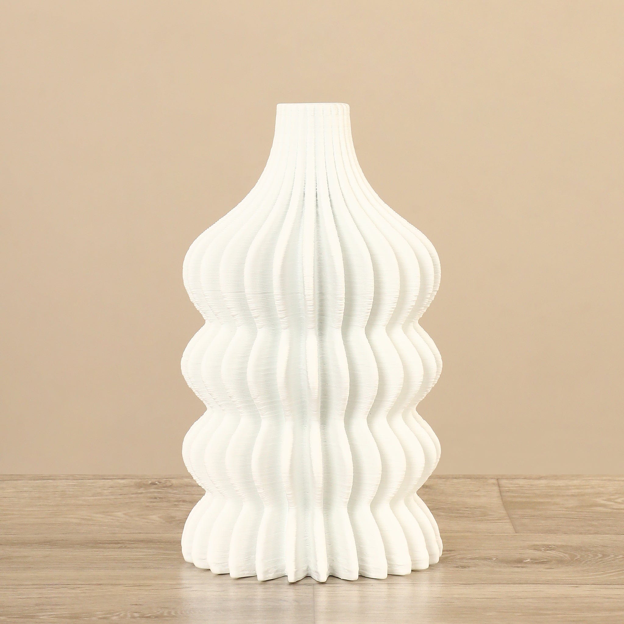 Simplicity and minimalist elegance give this ceramic vase a sleek, modern look. Crafted from ceramic, it features a contemporary scallop design creating a clean, understated look. This vase is sized to fit neatly onto shelves or tables.