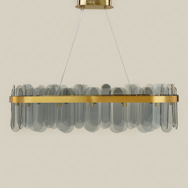 This stunning chandelier is evocative of a captivating piece of art, adorned with smoked glass shades and gleaming gold trim. Meticulously crafted to cast a beautiful glow, this modern fixture infuses any space with brilliance and vibrant energy, promising to elevate the ambiance to new heights.