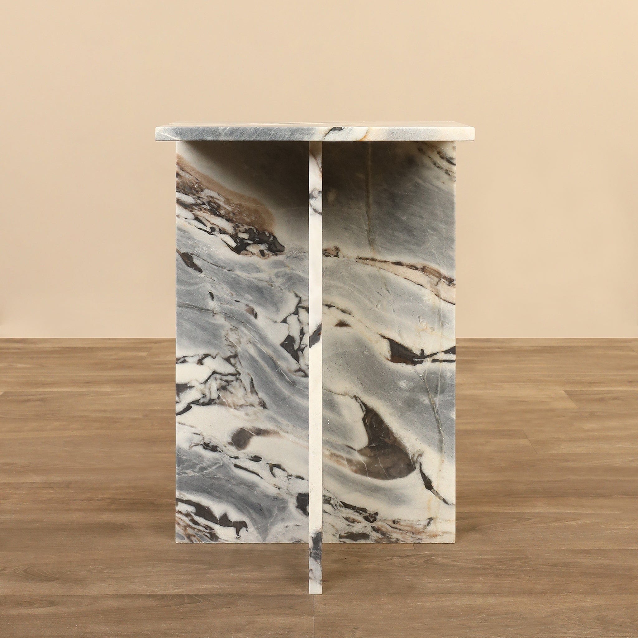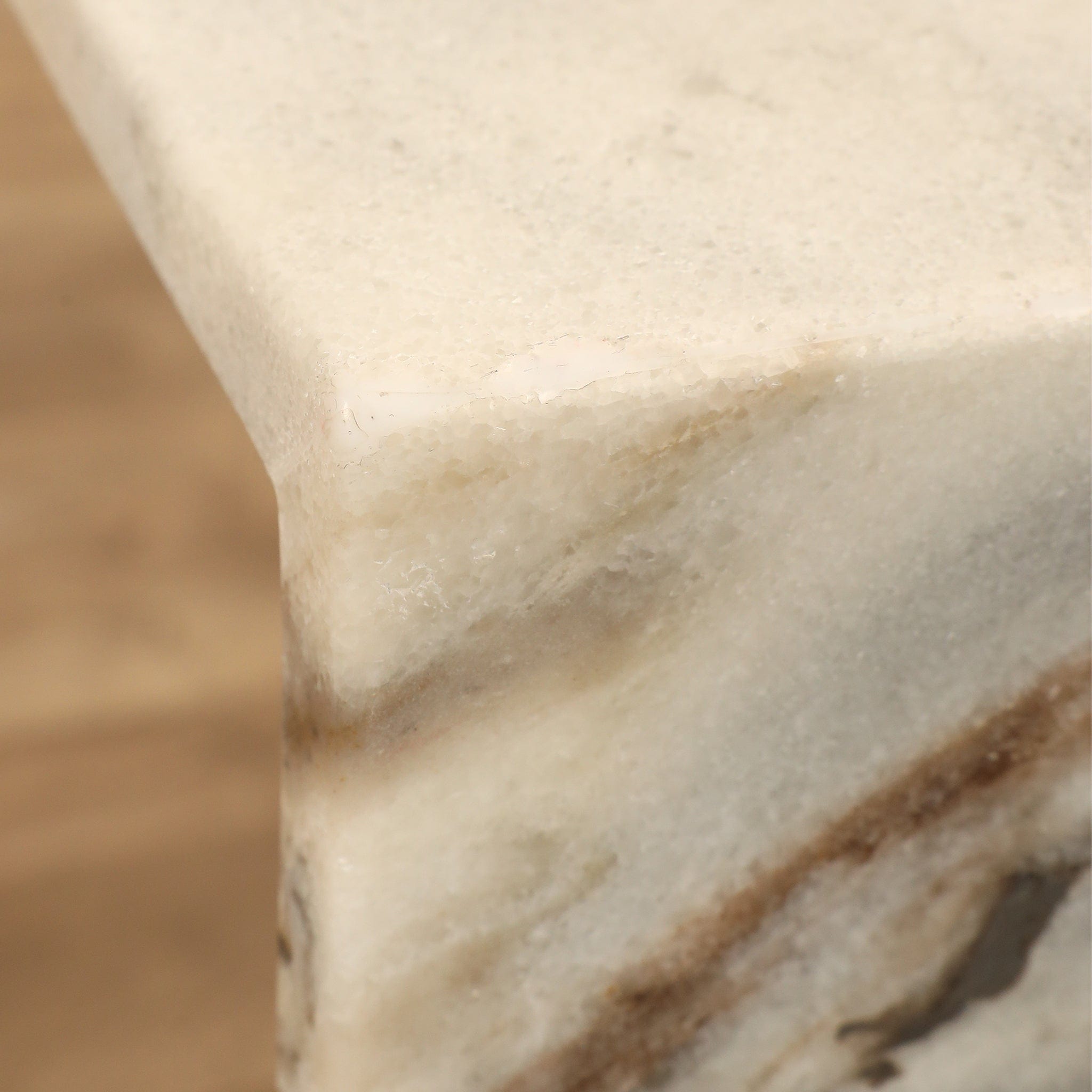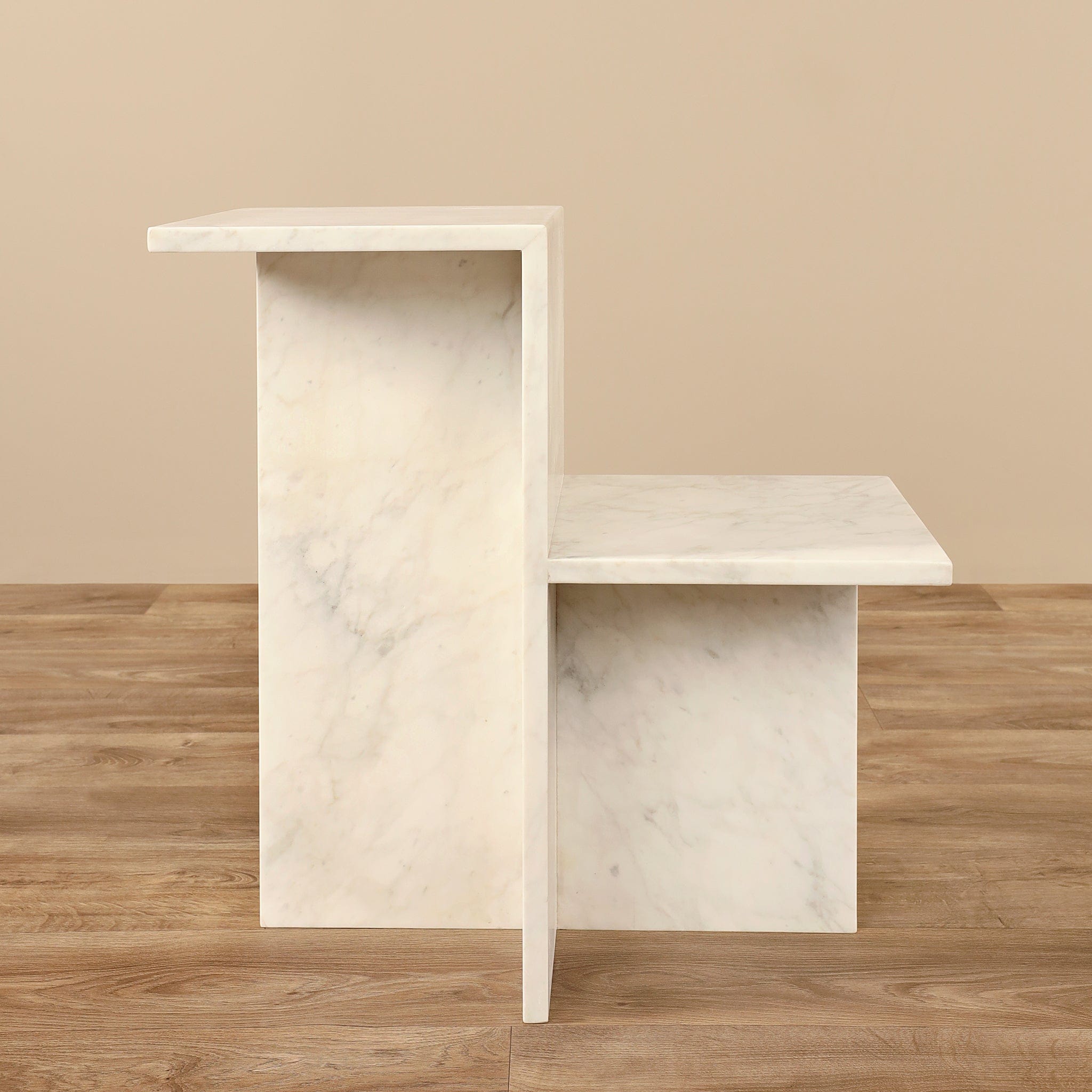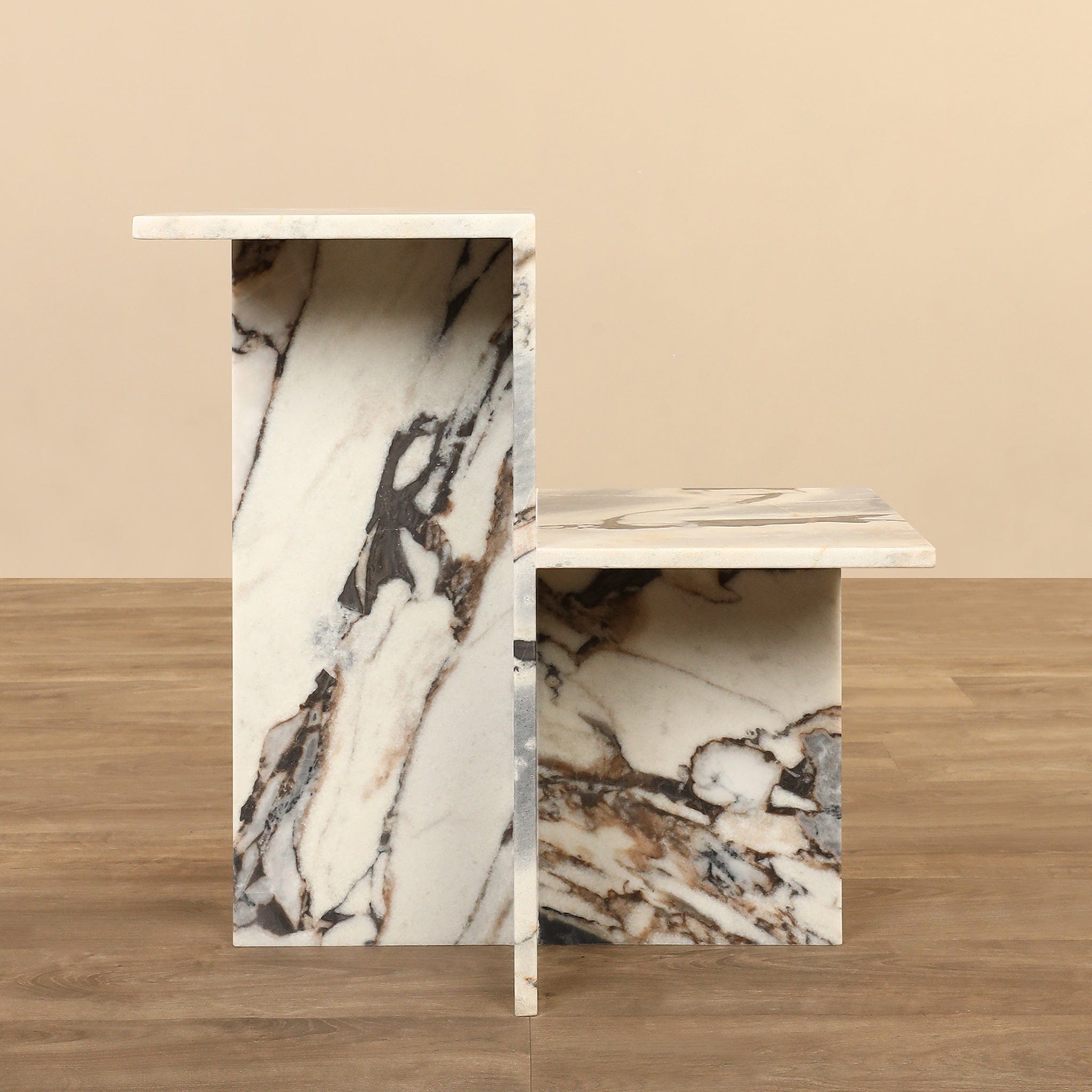 Varying heights in natural marble make the Cordelia side table an excellent choice for a contemporary aesthetic. The rich, veined marble is a wonderful material for a sleek yet functional side table to lend a statement-making look to a room.