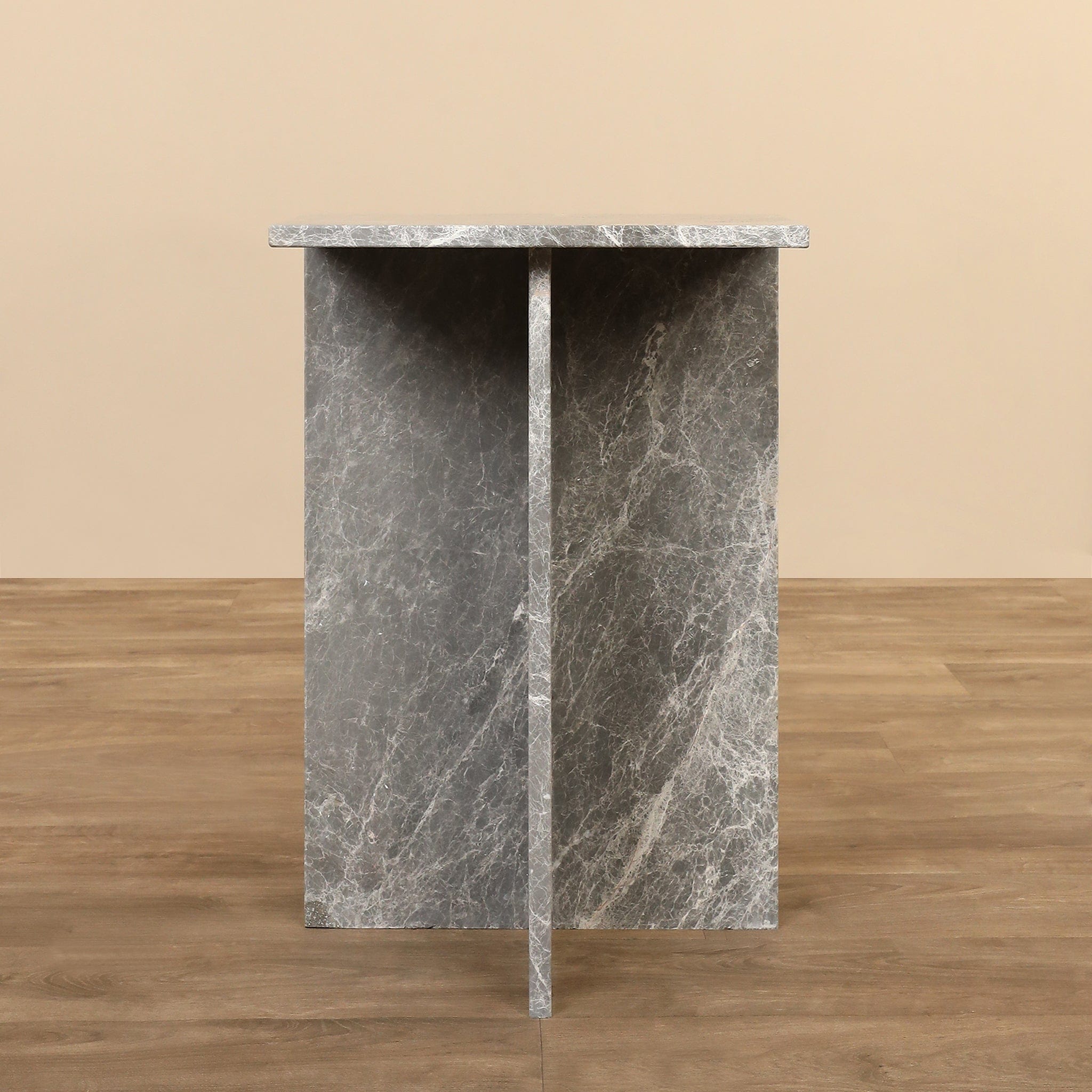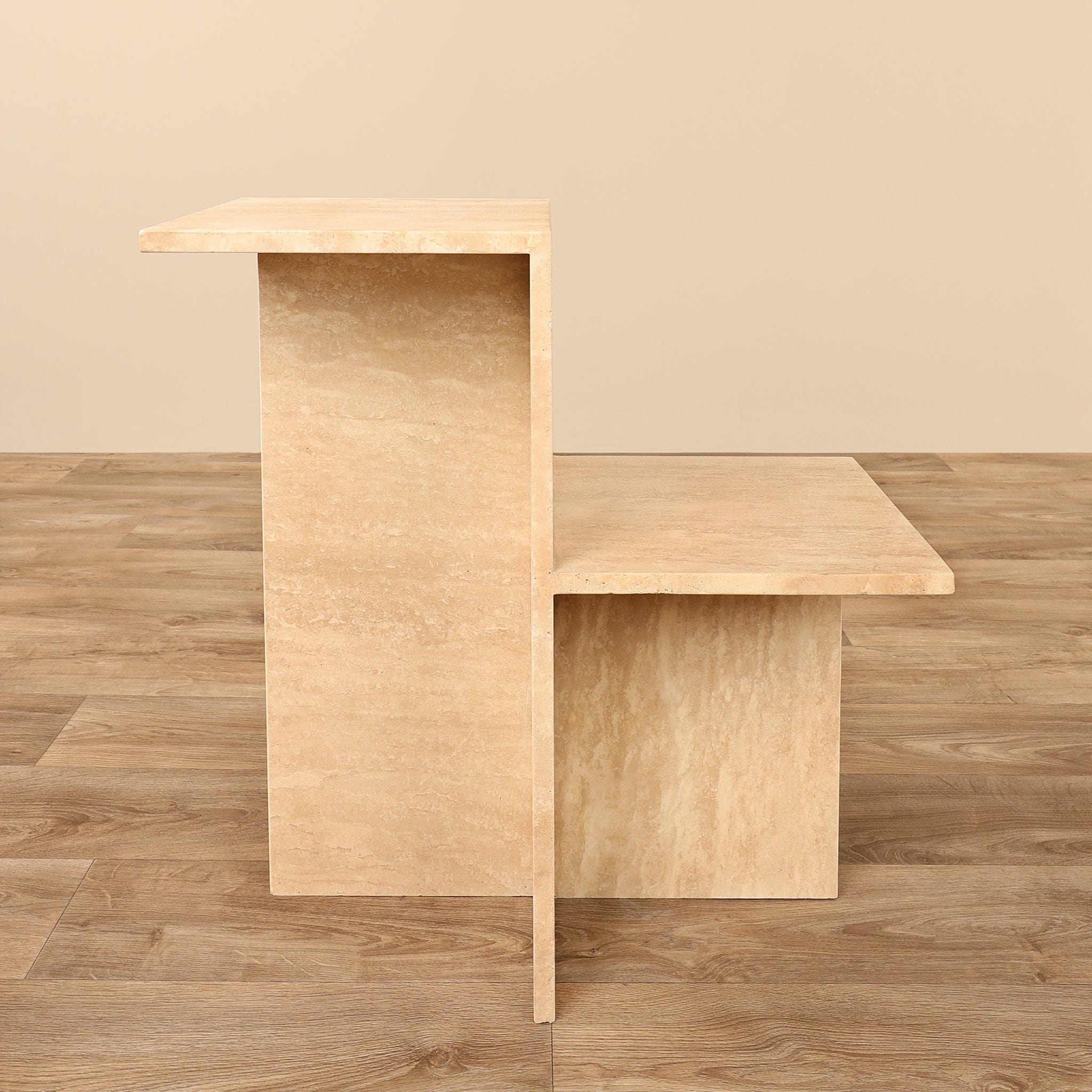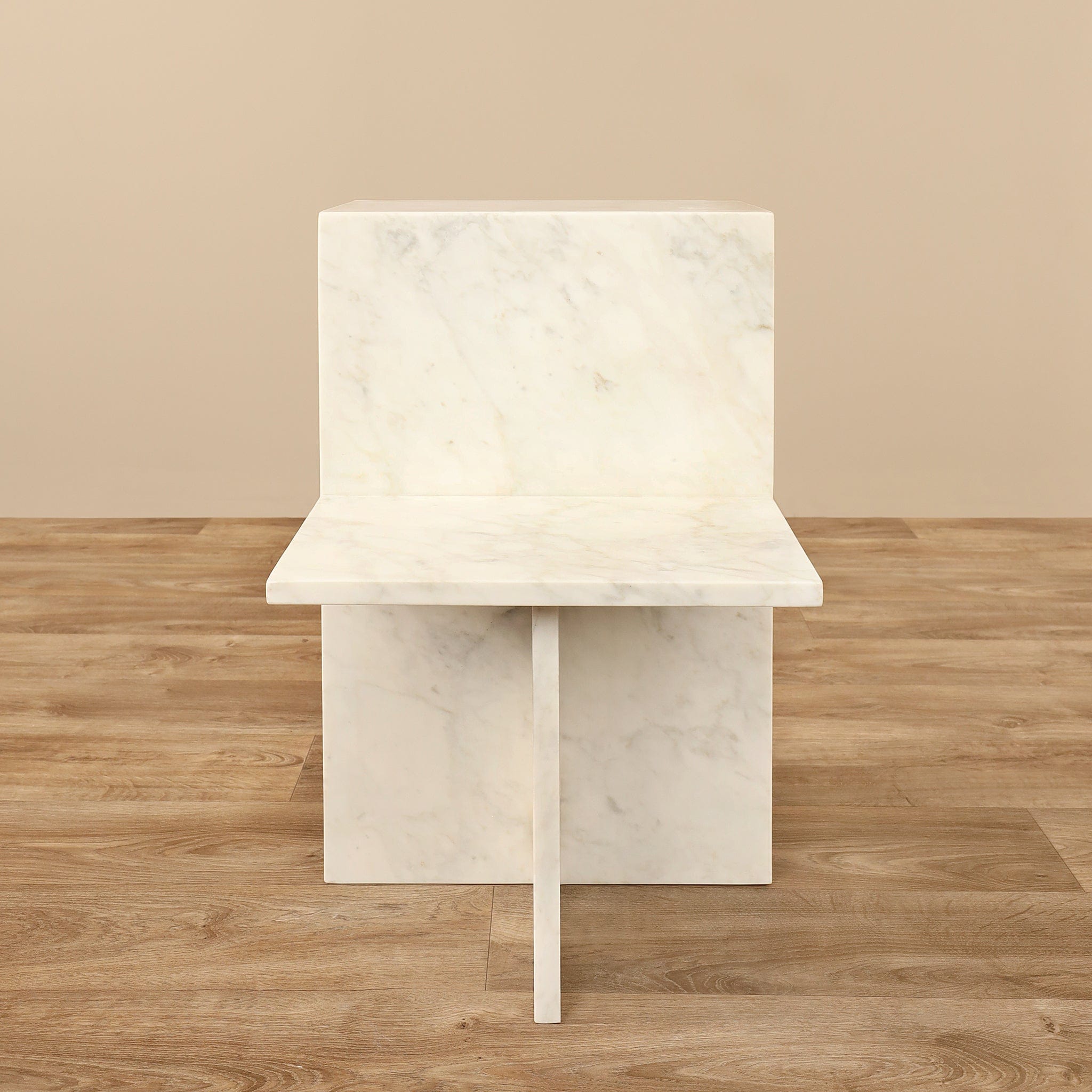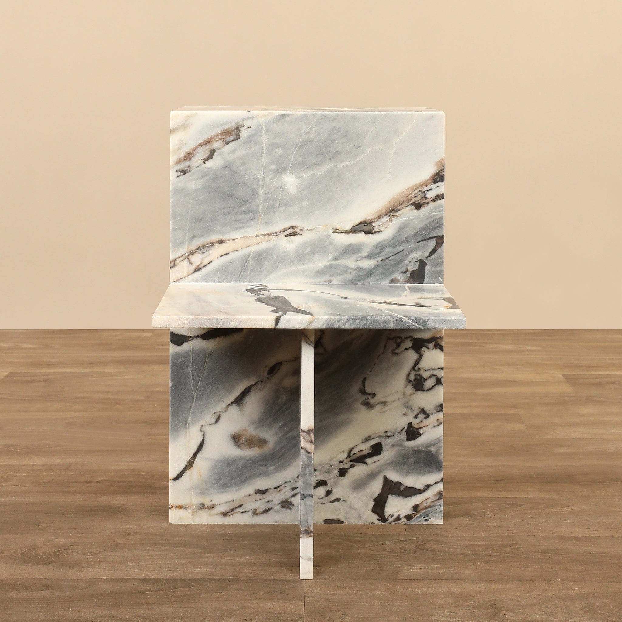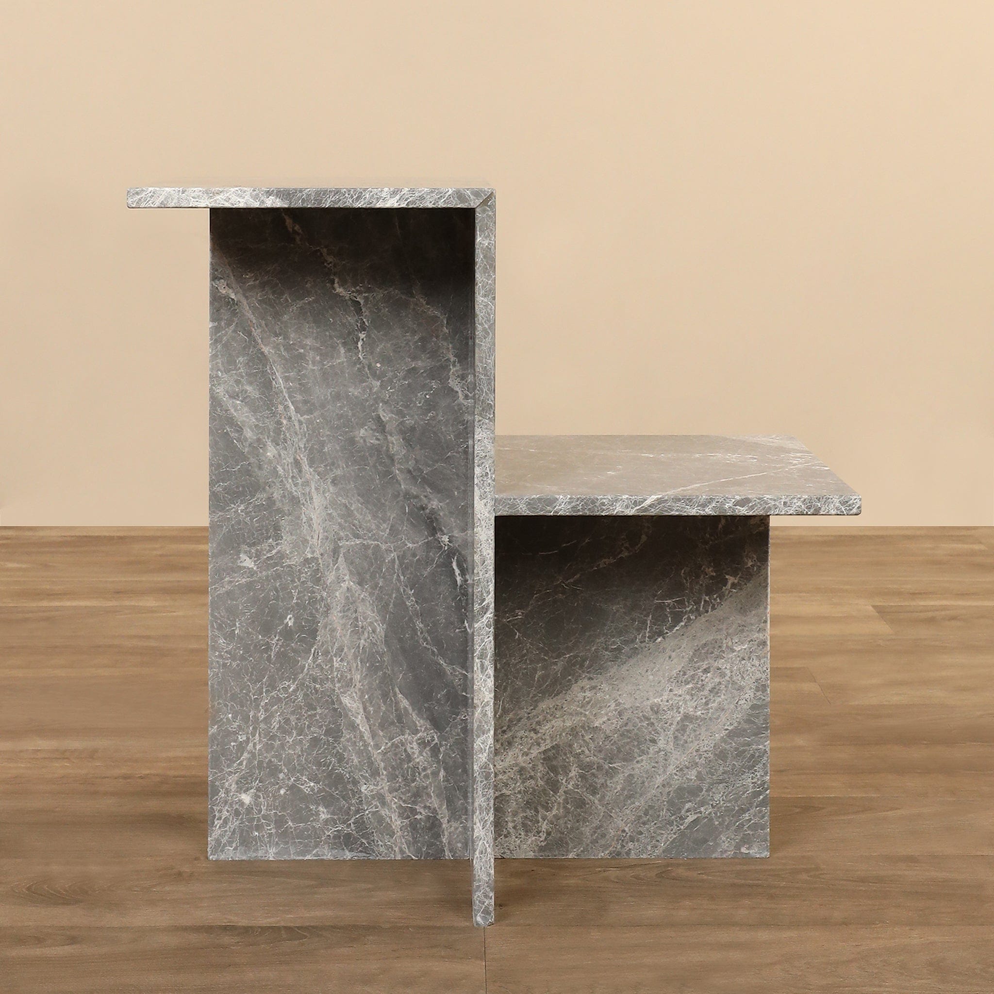 Varying heights in natural marble make the Cordelia side table an excellent choice for a contemporary aesthetic. The rich, veined marble is a wonderful material for a sleek yet functional side table to lend a statement-making look to a room.