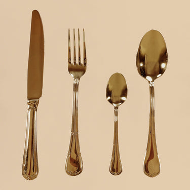 Set a beautiful table with this handsome 4 piece cutlery set. Designed in gleaming and durable stainless steel finished in gold, this coordinating set has elegant scrollwork and a classic tone to elevate a dining experience.