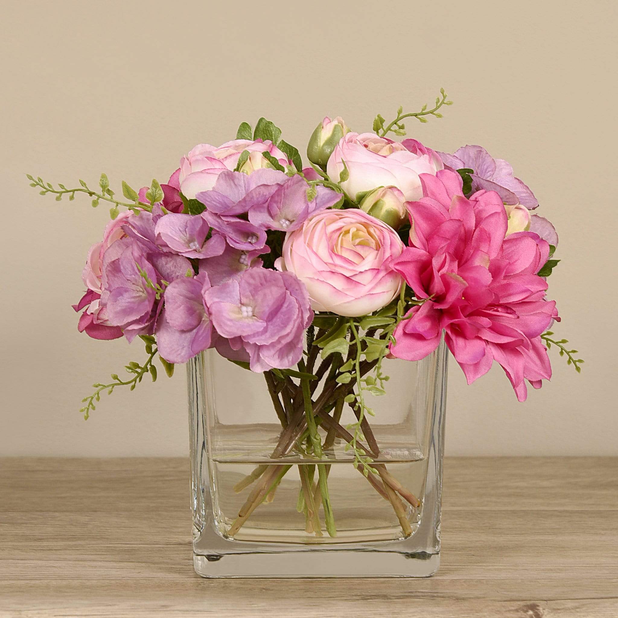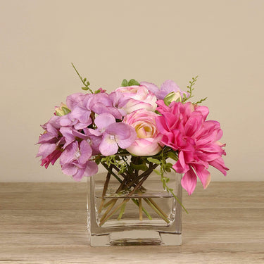 Pretty in pink. This pretty arrangement of artificial dahlias and ranunculus looks like it came straight from the local florist. Hues of pink, magenta, and purple really stand out against the delicate greenery and understated glass vase.
