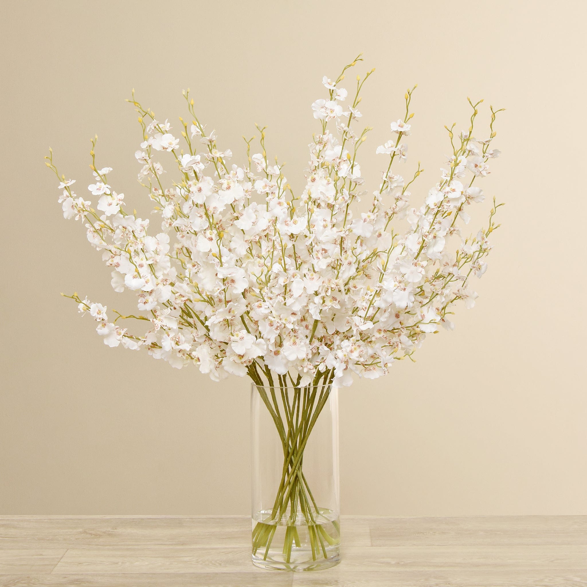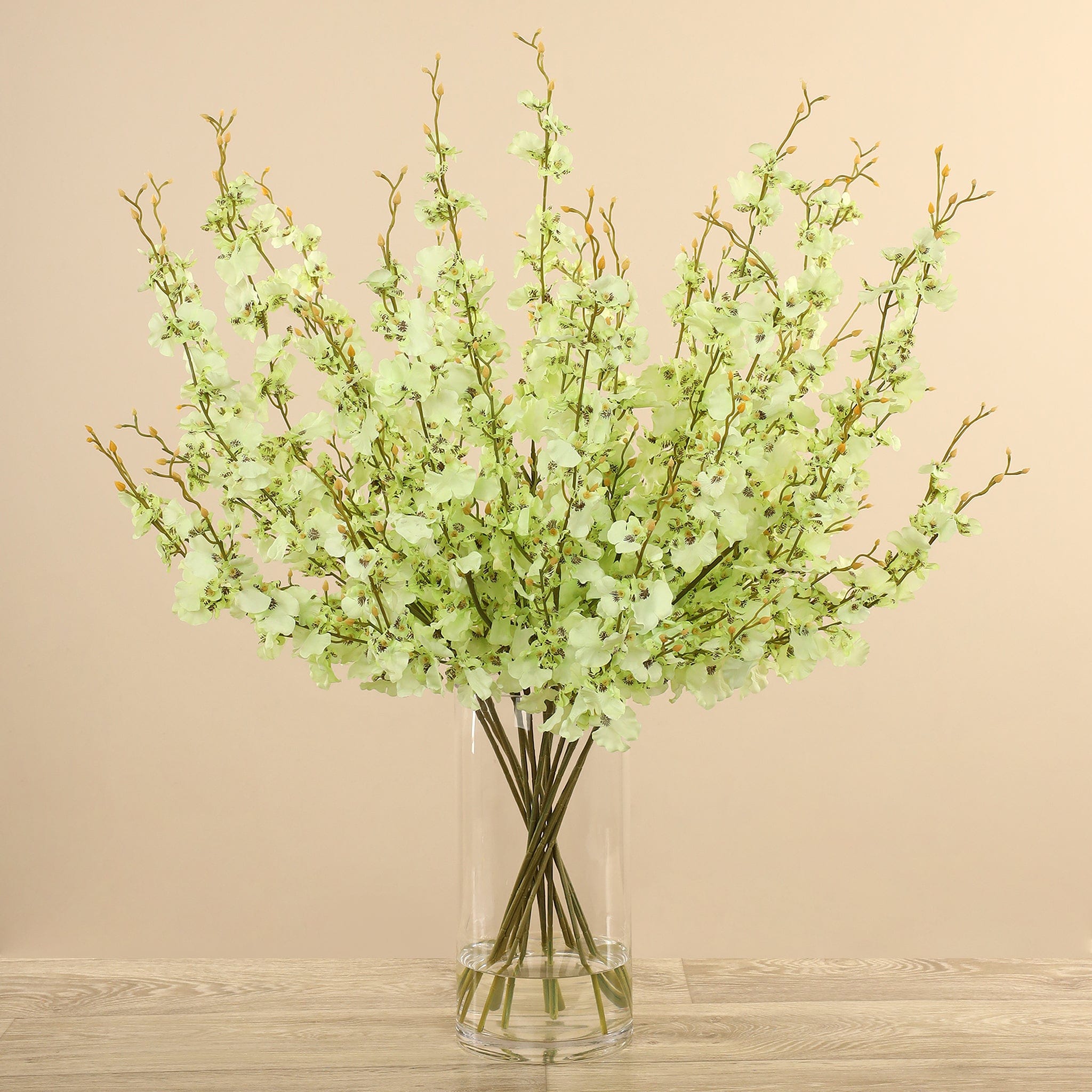Add an instant refresh to your space with the beauty of this artificial Dancing Orchid Arrangement. Displayed in a clear glass cylinder vase filled with faux water, the casually arranged stems of dancing orchid blooms exude grace and elegance. Each expertly crafted blossom captures the essence of natural beauty, while the lifelike appearance of the arrangement brings a touch of sophistication to any room.
