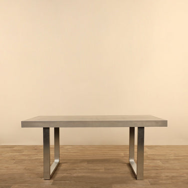 This Dining Table features a rectangular surface crafted in concrete with a stainless steel base. Suitable for indoor or outdoor use this minimalist table has a thick edge for a statement-making look.