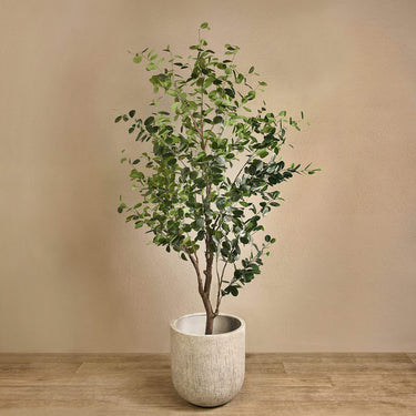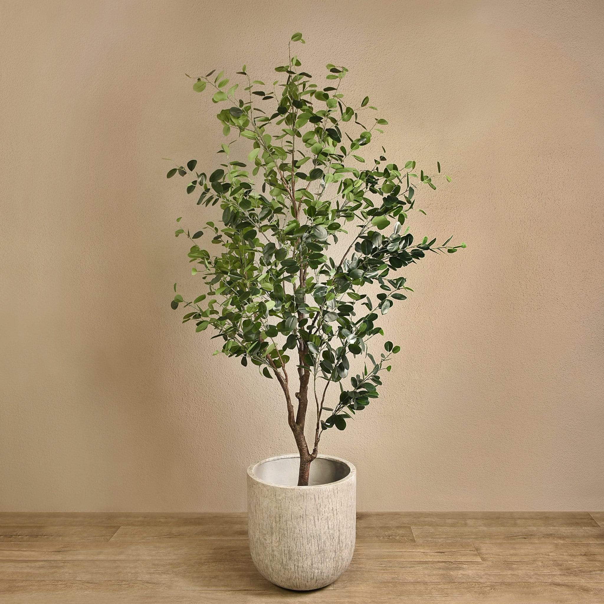 The classic indoor tree – now without any of the mess or hassle. This tall artificial ficus tree features a remarkably lifelike trunk and lush green silk leaves. It arrives fully assembled – just bend out the branches, place in a pot, and decorate your room.