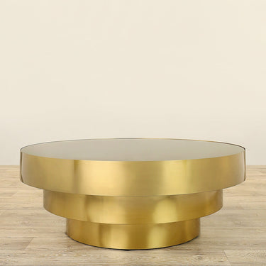 Crafted with meticulous attention to detail, the Forli Coffee Table features three round discs artfully stacked in an inverted pyramid formation. Its sleek lines and precision pay homage to the timeless Art Deco aesthetic, making it a statement piece for any interior. Elevate your decor with this stunning Art Deco-inspired gold-finished coffee table, where form seamlessly meets function.