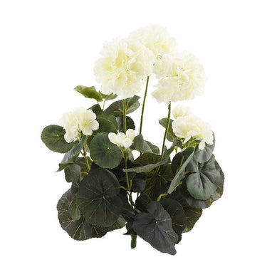 Long a favorite for avid and casual gardeners, the Germanium is recognizable by its lush ruffled blooms and large green leaves. This artificial geranium stem could be used in a pot for cottage charm or tucked into an arrangement or wreath for maintenance-free beauty.