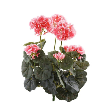 Long a favorite for avid and casual gardeners, the Germanium is recognizable by its lush ruffled blooms and large green leaves. This artificial geranium stem could be used in a pot for cottage charm or tucked into an arrangement or wreath for maintenance-free beauty.