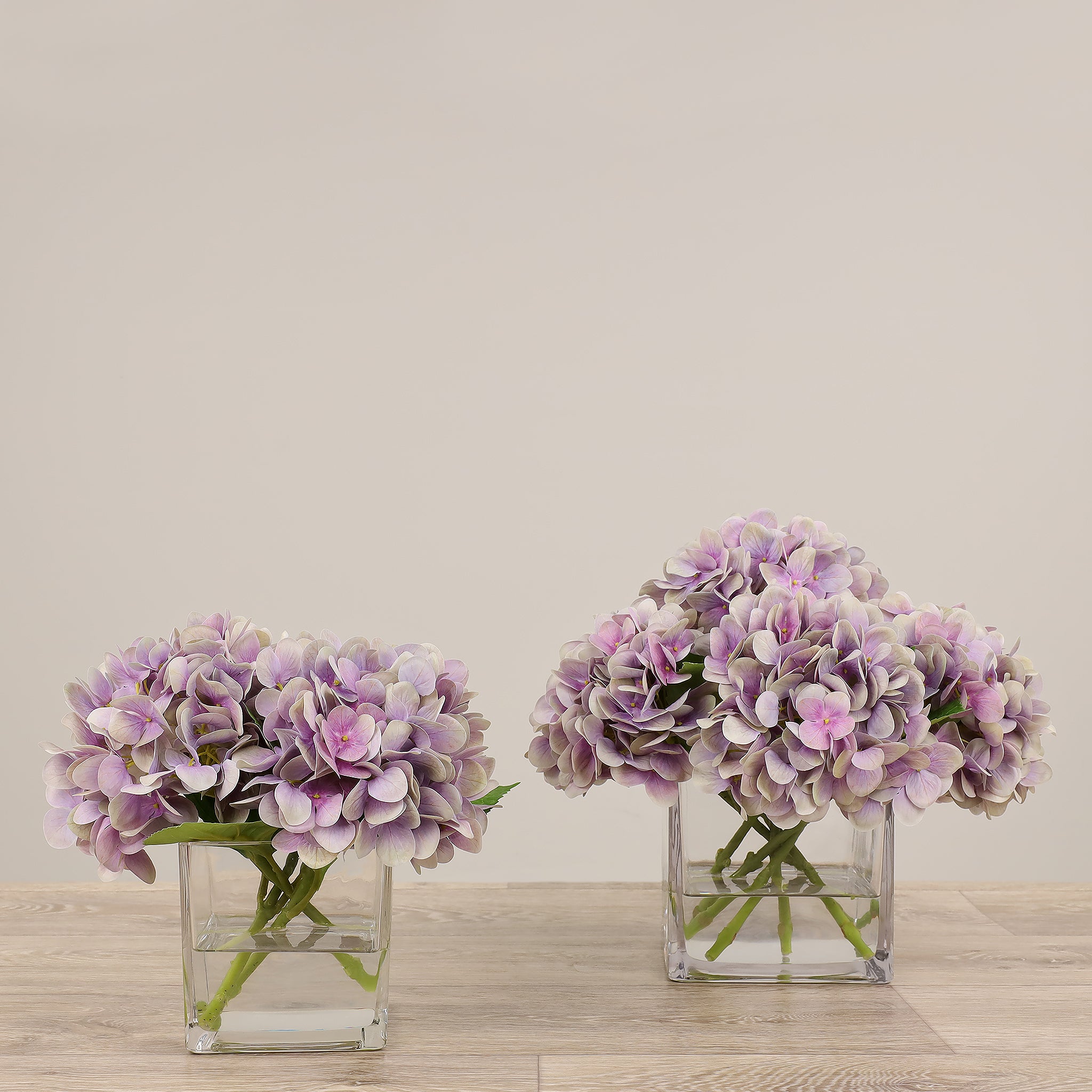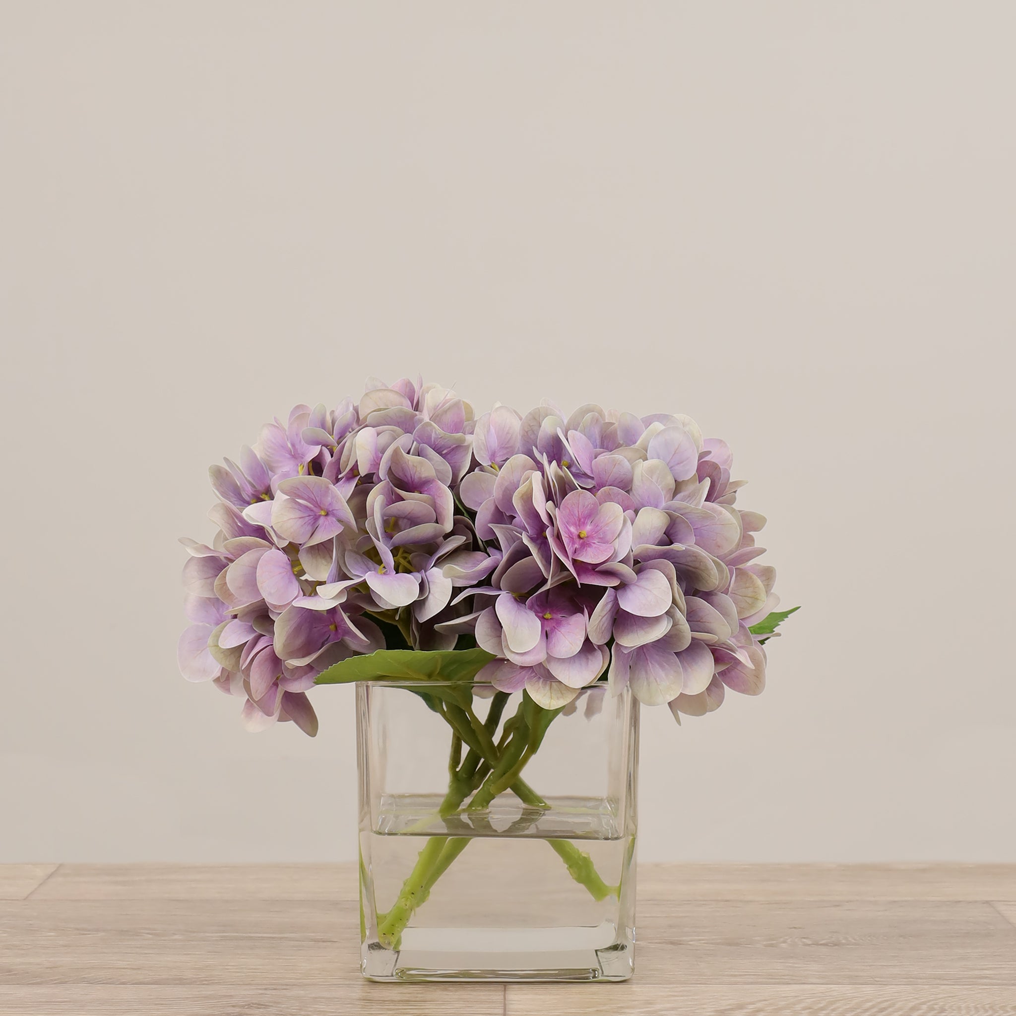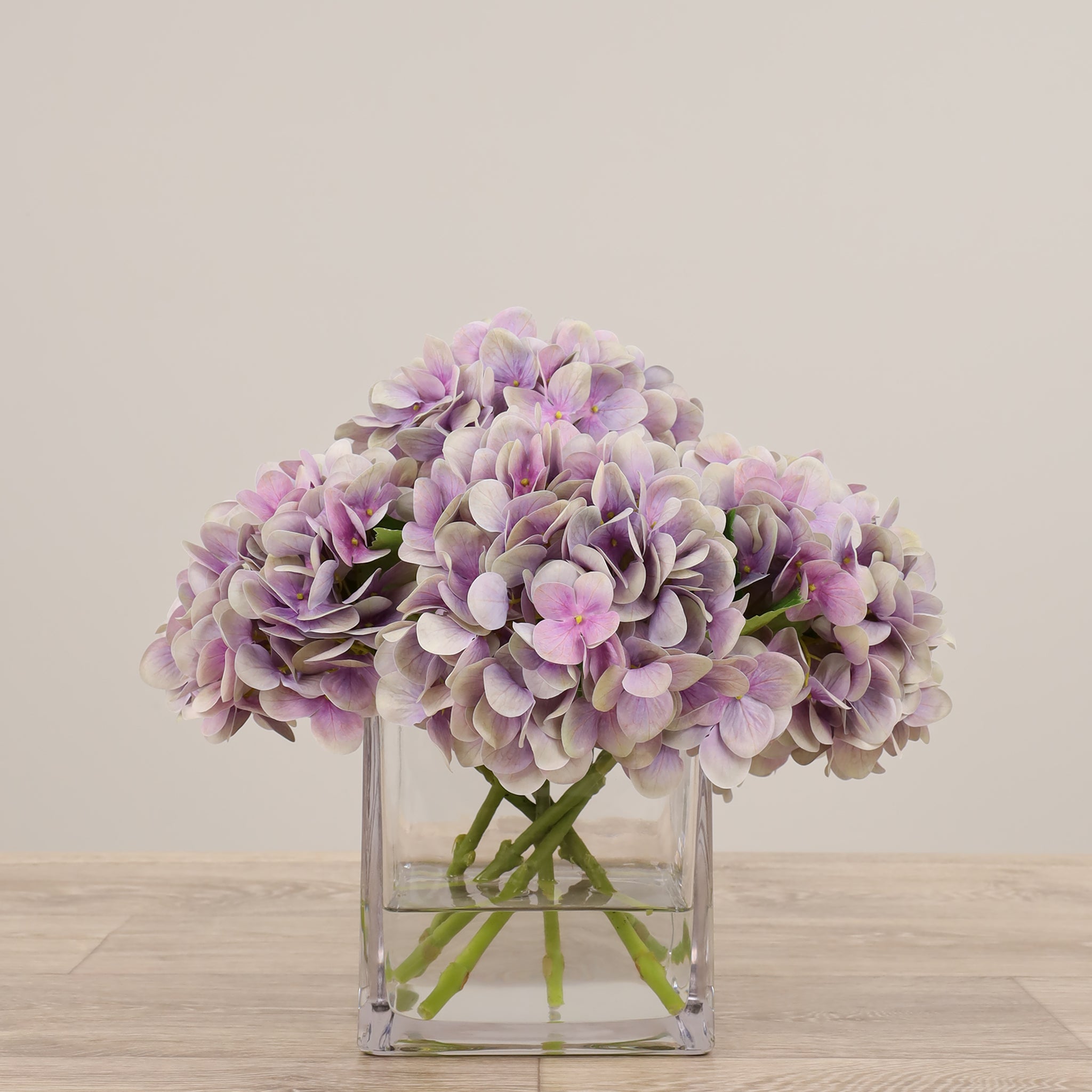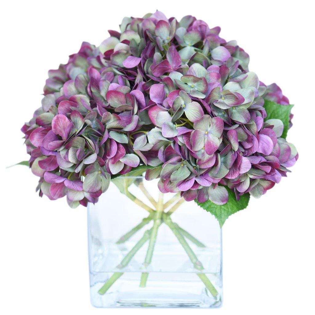These silk florals look stunning as a centerpiece for special events or placed on a dresser for everyday beauty. Crafted by florists with lifelike faux hydrangeas, these blue, purple, green, or white flowers are artfully assembled in a square glass vase.
