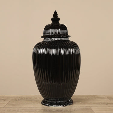 The classic ginger jar style is reimagined with a monochromatic black finish and a modern fluted design. Sometimes, simple pieces make the biggest statement. This beautiful jar features a chic silhouette and a removable lid for effortless storage.