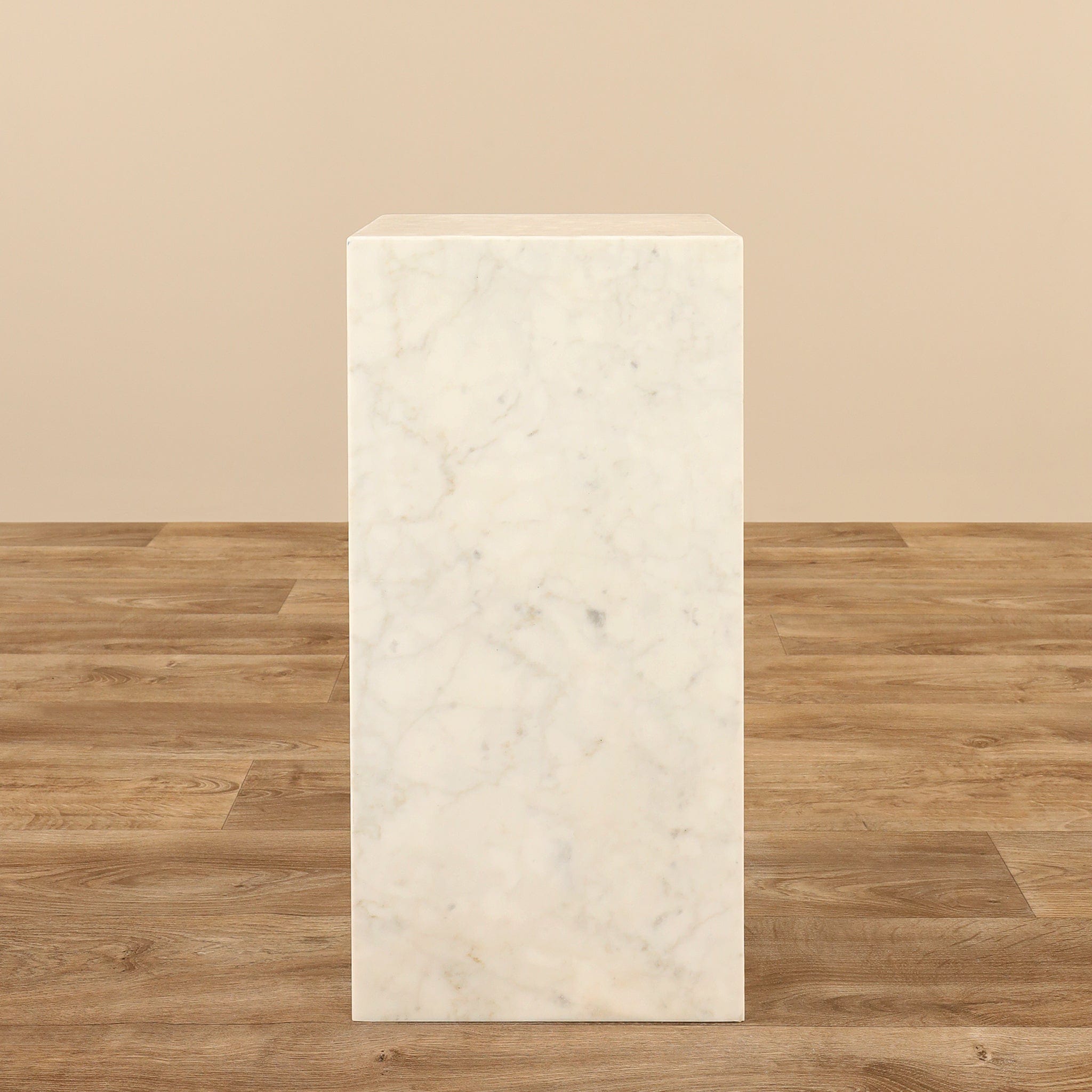 Bold construction and a brutalist silhouette make the Juniper side table a great size and style for mixing in a living room. It's shaped like a solid cube in gleaming marble with clean-lined edges for a minimalist look.
