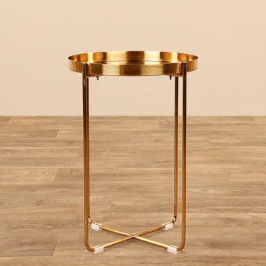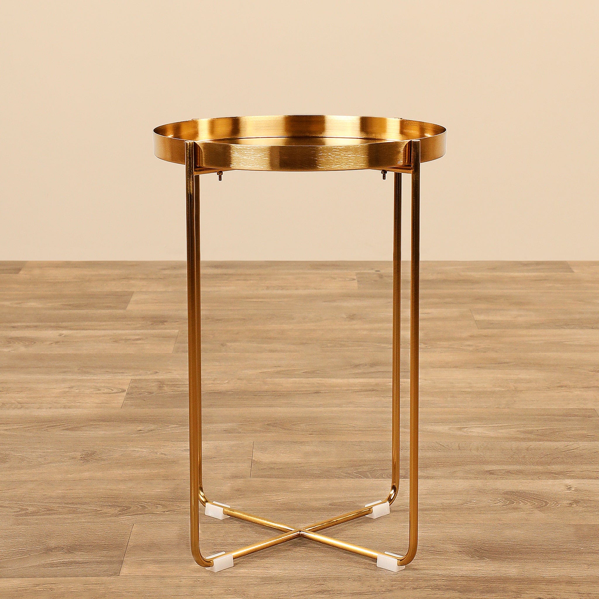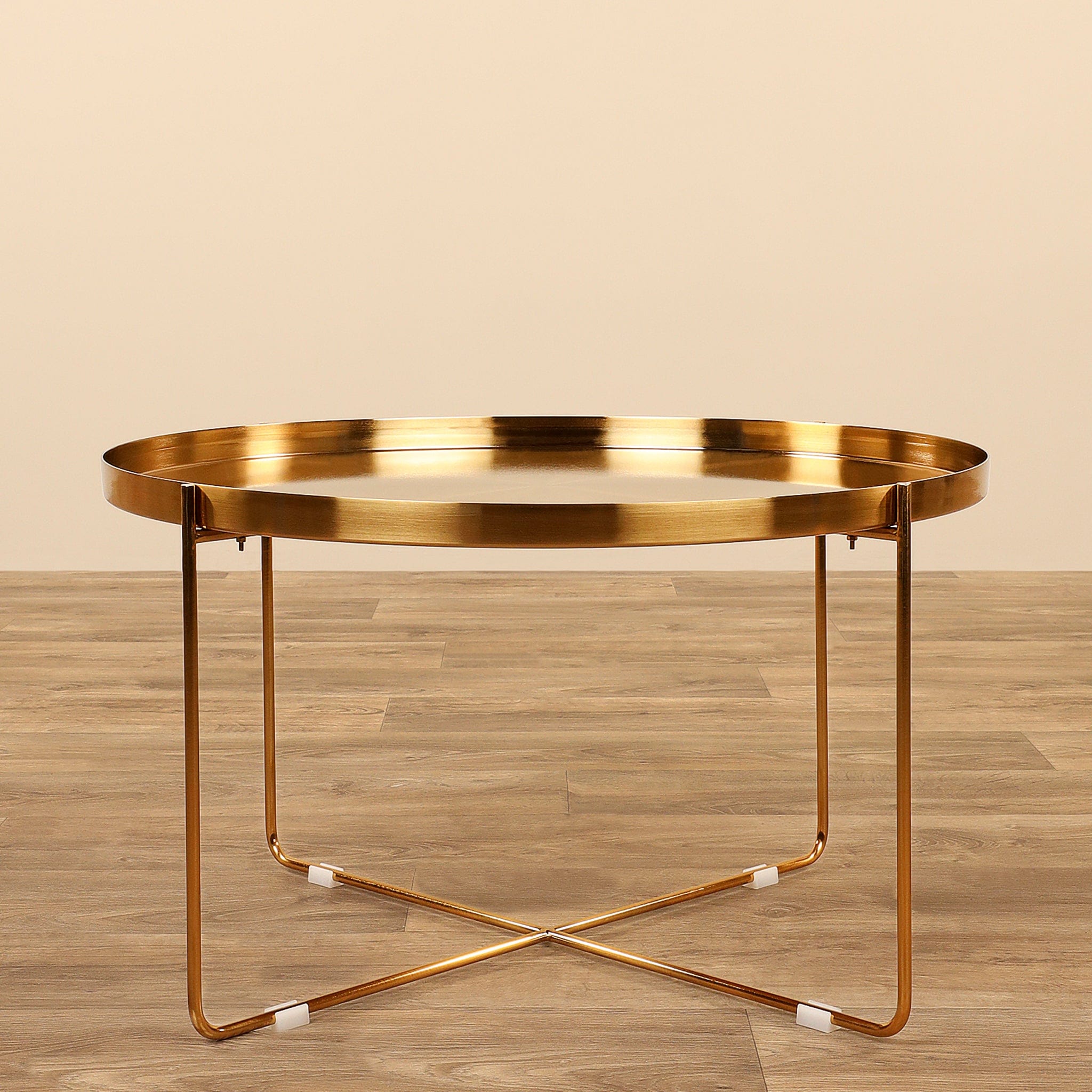 Simply designed this set of gleaming metal tables would be the perfect complement to a contemporary aesthetic. The Lia coffee table and coordinating side table both feature slim crossed supports and a round top with low sides for modern appeal.